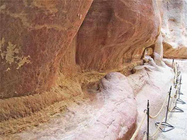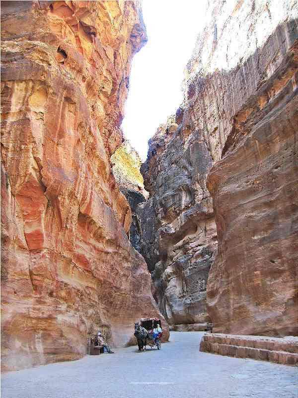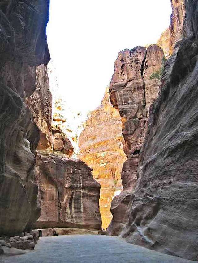 如今走Siq很容易,大部分路段已经铺成柏油路,剩下的路段也有原初纳巴特人铺的大石块,除了步行,还看到有游客乘坐马车,听马蹄滴答滴答的声音在峭壁间回响,也是很独特的体验。(上午往里走的时候没看到其它动物在Siq里,下午出来的时候看到有驴。)有的地段因为太窄了,采光不足,就显得有些昏黑,但转个弯,就宽敞起来,阳光照在崖壁上,也倾斜在狭缝的通道里。这种光影变幻,对游客和摄影师们也是极其有吸引力的。Siq通道两边崖壁上也留下不少神龛、以及刻画商旅骆驼队的浮雕,大多都风化得看不出形状了,也看到有沿崖壁凿出的取水通道