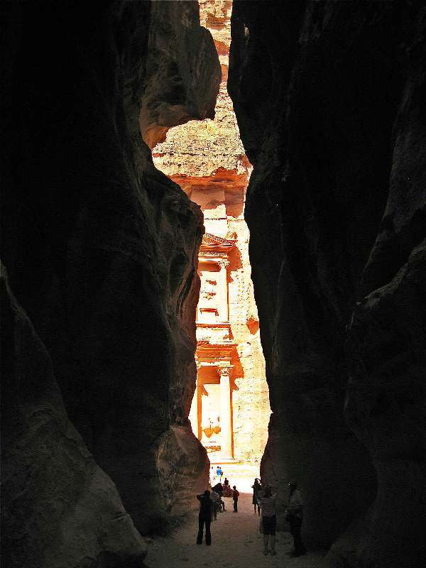 这段奇特的通道有2公里长,走走停停,边看边拍照,走了30多分钟,就到了最后一个转弯处,还没到的时候就注意到很多游客围在转弯处对着通道拍照,估计已经到了能看到treasury神殿的位置了,凑过去看,果然是的。如果独自走过这狭长通道,在没有心理准备的时候忽然看到这狭缝中闪现出神殿的正面来,一定是很震撼的,但眼下这么多游客聚集在这里,就难以体会到这种视觉冲击了