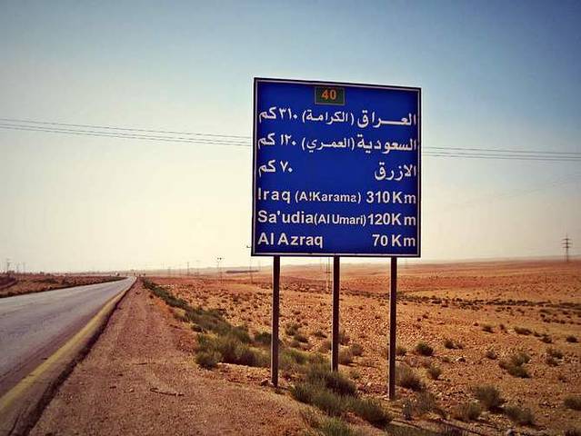 8点准时出发,同行的还有两位住户,一个辞职旅行的爱尔兰小伙子,一个在欧洲实习的美国大学生。爱尔兰人坐副驾,剩下三个人挤在后排,活动空间都很小,但一路聊天,也不觉得很漫长。从安曼一路往东,是一望无际的沙漠,杂乱地长着一些低矮的植物,高速路路况很好,看起来是频繁维护的。路上有路标,显示是前往伊拉克方向,司机停车,我们下车拍照。沿途也见到不少运石油的油罐车,不过不是约旦出产的石油,是进口的或者过境的。约旦东部有很多沙漠城堡,路过一个并非我们要去的城堡的时候,因为就在公路旁边,司机问我们是否要进去参观,门票1JD,而司机却说因为不在计划内,要加收5JD,我们就一致决定继续赶路,没有停