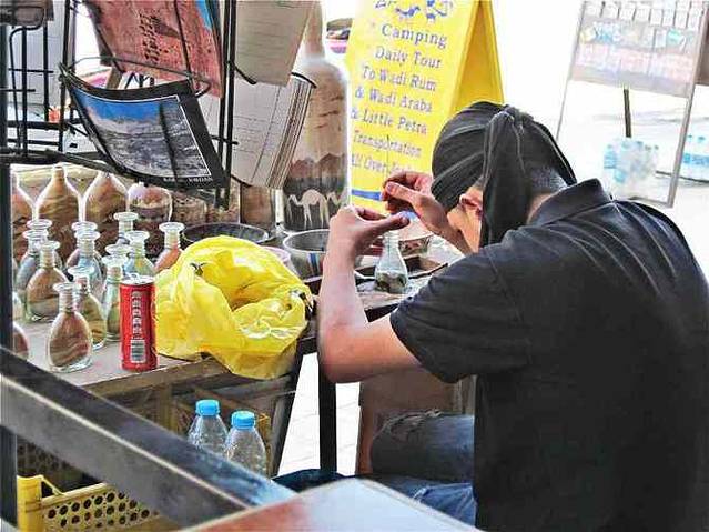 从检票口出门,回到上午进门时候看到的几个沙画摊位,在景区里也见到一些,价格和景区外一致。我买了一个小瓶固定图案的,1JD,又买了一个中瓶要求小贩写名字在画面里的,出价10JD,我还到6JD成交。就看小贩熟练地把瓶子上四分之一的沙子掏出,又用不同颜色的沙子把名字加在画面里,工艺看起来很简单,就是按照图案把不同颜色的沙子撒在特定的位置,但操作起来还是要手很巧才行,不过小贩做起来都很快,不到5分钟就搞成了