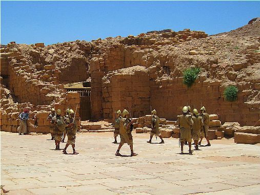 罗马街最西端尽头是个还能看出形态的凯旋门,门边也聚集了一群和在Siq入口看到的一样的纳巴特或罗马“武士”,这里的“武士”并不仅仅是站岗,还在列阵表演某种军事操练,围了不少游客在拍照、摄影,但也有人找游客要donation,同样也声称是为了维护古迹,很难搞懂这些人是景区官方的,还是某些私人团体