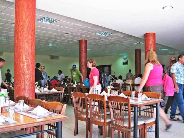泡了一会儿,就回到岸上,找冲水的水龙头冲掉腿脚上的盐水。到午饭时间了,这景区里的餐饮也是垄断的,只有一家自助餐厅,13JD/人,饮料点了一杯橙汁,另付2JD,真够贵的(在餐厅门口的饮料店买矿泉水也贵,在安曼买中瓶1.5L的1JD,这里小瓶的要1.75JD)。可以在室外吃,但天气太热,我就在室内坐下了。食物种类还算丰富,凉菜是各种蔬菜沙拉,热菜有烤肉等,主食、点心种类也不少。一边等旅伴漂浮,我一边在餐厅吃饭,有不少旅游团也来吃饭,不到30分钟就看到4、5批10人以上的group,把餐厅挤满了。包括还看到一个大陆的团,以及一个宗教活动的团。我们的司机和这里的导游也都认识,也在这里吃饭,不知道他们要不要付钱,反正司机进景区是不收钱的