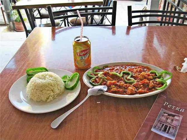 在景区里没有正经吃饭,另外本来说好5点在movenpick门前停车场有酒店的shuttle,我到这里正好5点,却没看到shuttle的影子,就决定在回酒店前解决晚餐,然后打车回去。movenpick饭店旁边有几家餐馆,价格都差不多,比town里贵一些,但也没有贵太多,因为wadi musa镇本来就比其它地方要贵了。挑了一家最靠近movenpick的Mystic Pizza,点了据说是本地特产的gallayah,就是咖喱饭,可以配鸡肉或牛肉,我挑了鸡肉,于是一盘菜,一盘米饭,分开端上来的,一共6JD,还花2JD要了一听iced tea,和景区里一样价格,中瓶的矿泉水也在这里买了,1JD,和town里是同样价格。