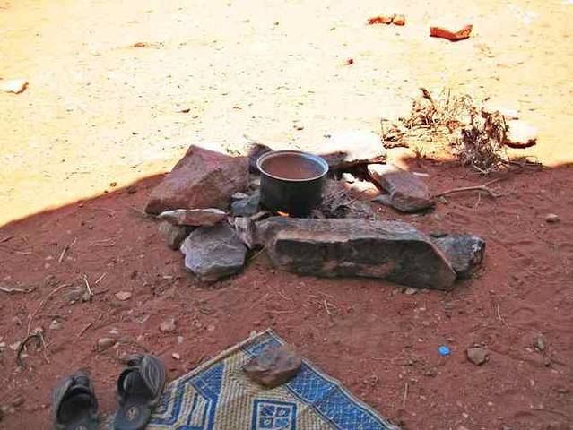 驴友在这里看司机做饭,我就到附近地势稍高的小沙丘转了一圈,这时已经过了中午11点,天气和上午比已经很热了,所以也没有走很远,视野依然不错,可以俯瞰周围的沙漠、山丘。回来以后,司机已经支起锅了,这里原先就有一圈石块围成的“灶”。食材很简单,有几瓶罐头是肉食、奶油和hummus,打开就可以吃的,临时做的一锅菜是大杂烩,司机切了西红柿,和豆子搅拌一下,下锅煮熟即可。