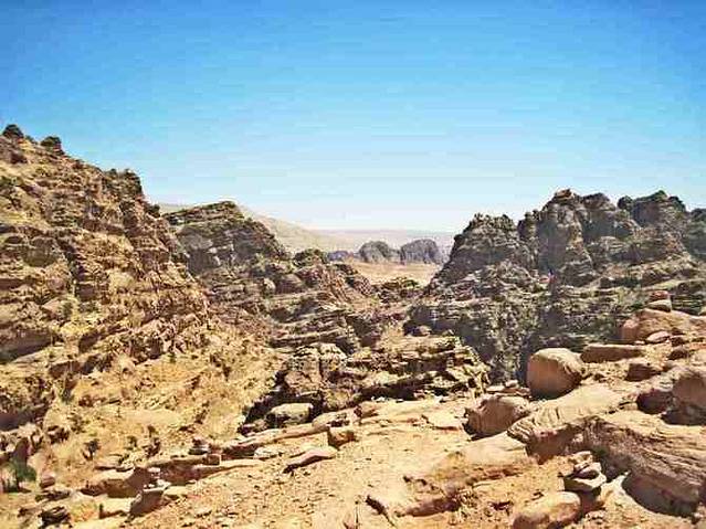 在凉棚休息的时候,遇到前一日碰头的李同学,他出门更早,但按照LP建议的徒步路线,多走了一些地方,所以到Deir的时候比我还晚。和他一起,在Deir前仔细看了看,可惜无法入内,正门的门槛距离地面有1个人高,没有修台阶。又从Deir出发前往周围的2个view points,前往view point的路上要注意碎石子堆起的路标,免得迷路,单程都要走10-15min左右。在走到观景台的路上,可以俯瞰Deir修道院,竟然看到有游客顺着旁边崖壁上的陡峭石阶爬到二层瓮形结构的顶端了!也可以看到附近的山谷、山丘,但到观景台上,也很难看到远处的平原,因为进出的山峦把视线挡住了