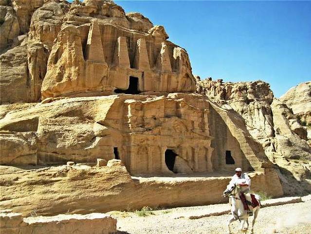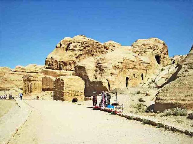 小广场里还有不少骆驼、马和驴散在四处,等着搭载游客,除了在检票口进来后一段有马夫骚扰外,从这里开始,直到晚上出景区,就不断被本地人纠缠,询问是否骑马、骑驴、骑骆驼,也有一些是要提供导游服务的,不胜其烦。我发现越多和这些商贩说话,越甩不掉他们,只好装作听不见,他们跟着走一段,也就不跟了。这些本地人一般直接招呼我们为Japanese,我们不理睬,就改口Korean, Taiwan,我们仍然不理,估计该说China了,结果人家一幅恍然大悟的样子,哦,Malaysia!客观讲,我觉得约旦的中国游客够多的了,竟然还不足以改变本地人的印象