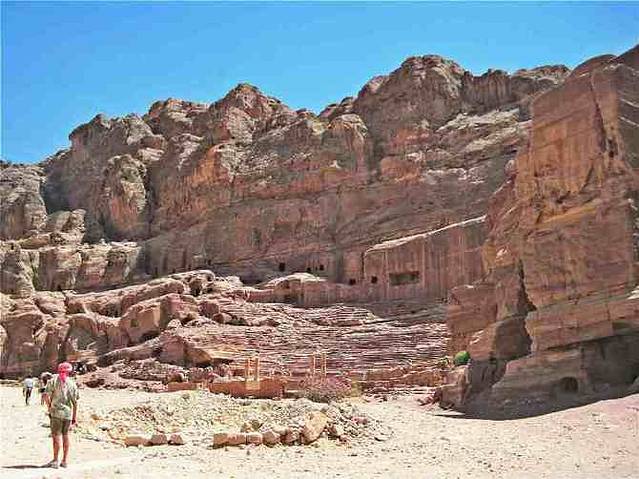 穿过facade street前半段就看到一个小广场,这里一侧是咖啡厅(景区里只有一处正规的饭馆,在basin区域,其它的室外咖啡厅,只能提供各种饮品、水果,不提供常规餐食,在Deir修道院门口的咖啡厅有卖三明治的),也有洗手间(景区里固定洗手间这是第一处,另外在Royal tomb区和到Deir修道院的山路前也有,都很干净,有人打扫卫生的,另外还有一些临时WC,所有WC都是法定免费的)。另一侧,有陵寝遗址,也有一处依山而建的罗马剧场。佩特拉的罗马剧场并不像在杰拉什、以弗所那样得到了精心维护,后者是因为要把废墟改造成仍可使用的有功能的剧场,而这里的剧场就任凭风沙侵蚀了,分排分区的座位都已界限模糊了,几根大石柱仍屹立在剧场外。可惜这处剧场不允许入内。在这处小广场还有通往high place of sacrifice的trail,这是我们下一天的安排