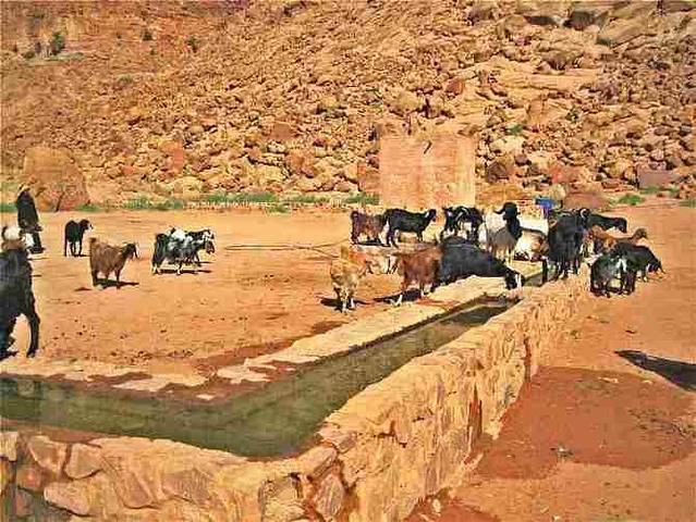 这就在客观上成了路,成了指路牌,司机也就不需再费心思寻找路径了。这里的沙漠并非连绵沙丘、寸草不生的形态,反而是有很多低矮的沙漠植被的。很快就开到了第一个景点,“劳伦斯泉”,这是一处山上的泉水,和劳伦斯其实没什么关系。当地人从泉水以管道引水下山,流到一处水槽里。司机就把车停在水槽旁边,水很清澈也很清凉,很快就看到本地人赶着牲口,包括骆驼来这里饮水。司机问我们要不要爬山,可以爬到泉水处,显然他是不会陪我们爬的。这是一处乱石岗,也没有像样的山路,我担心有扭伤腿脚的危险,就没爬,只看了看山脚下石块上有古代的inscription
