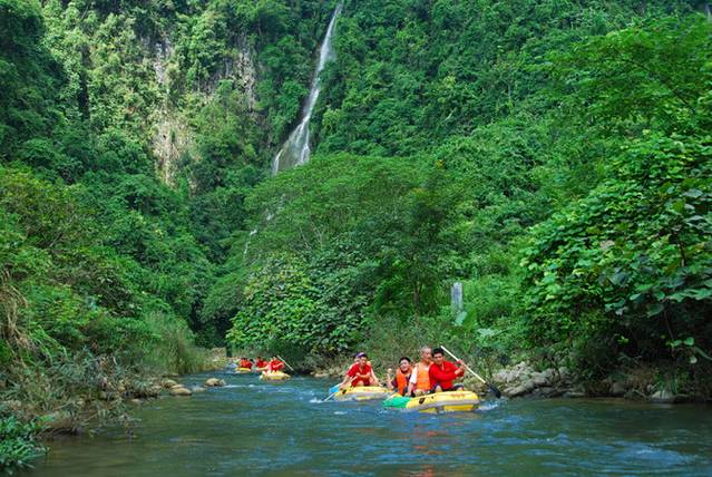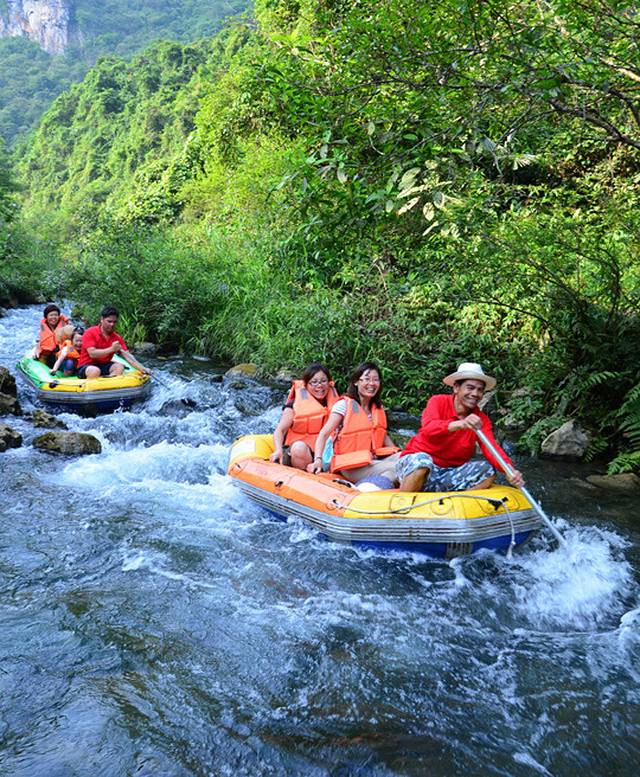 早上的古龙山大峡谷还是比较凉的,大家可以带件外套,游客可以先选择徒步游览,呼吸新鲜空气,做做有氧运动,顺着羊肠小道一路走,远处的山顶浓雾弥漫,可以欣赏到上千种植物,和数十个大小不一的瀑布,在原始的森林里看花儿开放,听鸟儿唱歌,感受不受任何污染的自然环境,享受难得的悠闲生活。漂流游览“三峡三洞”风光