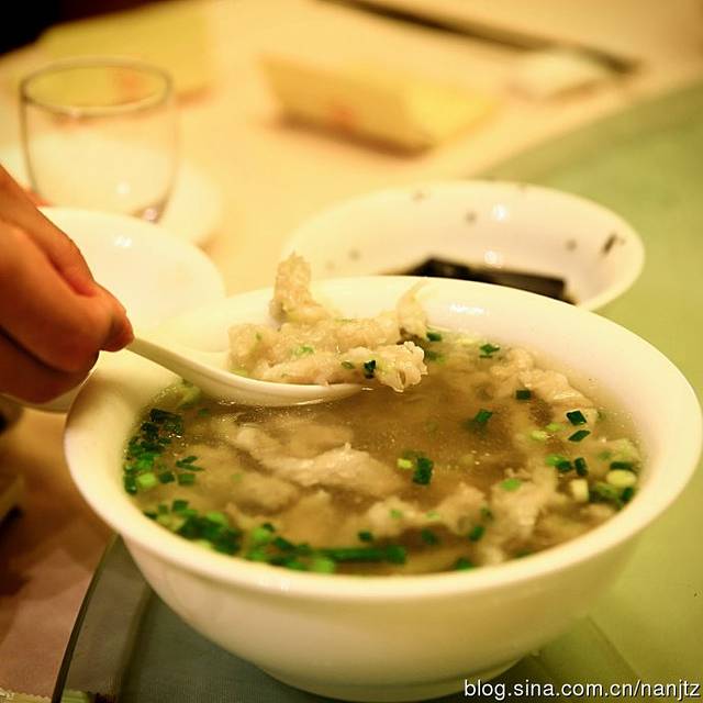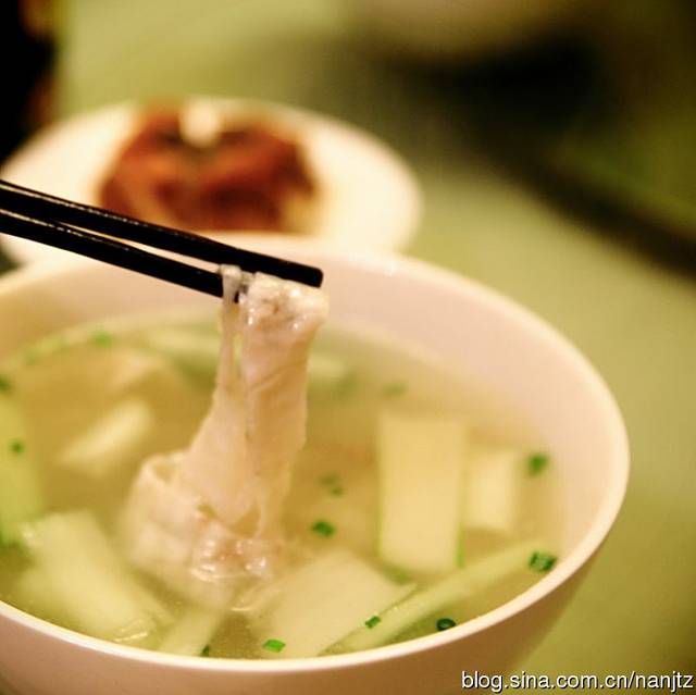 【敲鱼汤】:温州酒席中常上的一道名菜,鱼去骨和上面粉,敲得很薄很薄的一张,吃时把它切成一条一条的,辅料有火腿丝、萝卜丝、白菜梗,做成汤后再加醋,胡椒粉。吃起来不仅鲜,因为它是被反复敲打出来的,所以也特别有劲道。