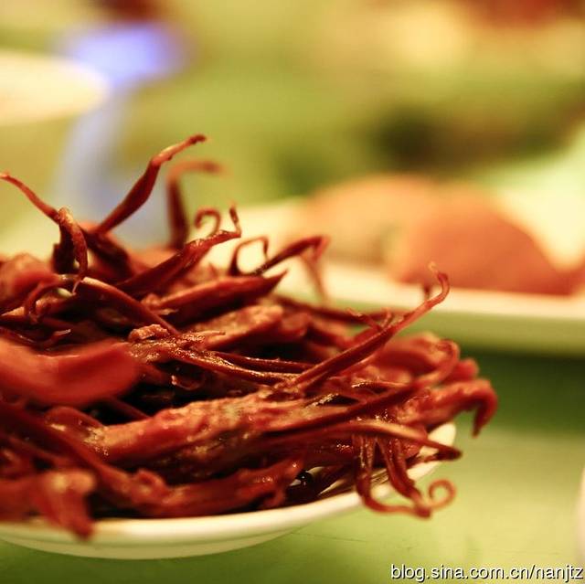 【鸭舌】:温州人称鸭舌为“鸭赚”,而不称鸭舌。在温州无鸭舌不成席,鸭舌是卤的,一道凉菜,风至半干,在口中细嚼,韧性十足。现在“温州鸭舌”早已风靡 全国,但要尝地道的口味,还是市区的菜市场里那些散装的。早年温州也是水城,就像威尼斯,瓯江紧邻大海,水系发达,饲养鸭子成风。也成就了一任永嘉知府谢 灵运,开了中国山水诗之先。
