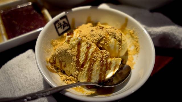 撒了黄豆粉的焦糖冰激凌,这种配法也是第一次吃到,那个黄豆粉好赞,后来还买了一种巧克力里面包裹黄豆粉和果子的糖,奇葩又美味!