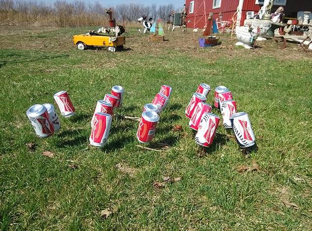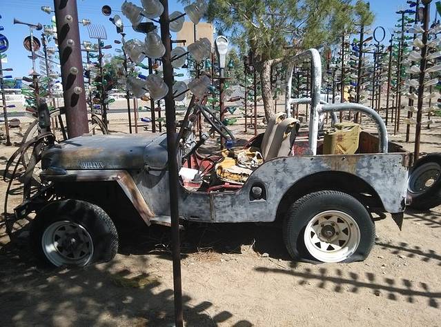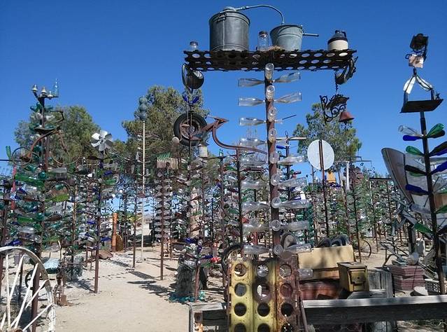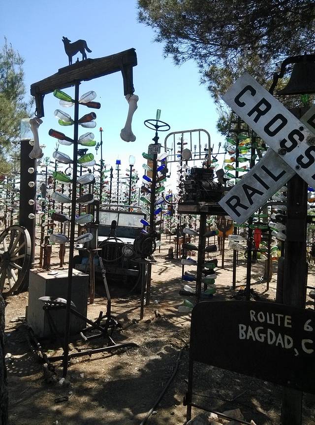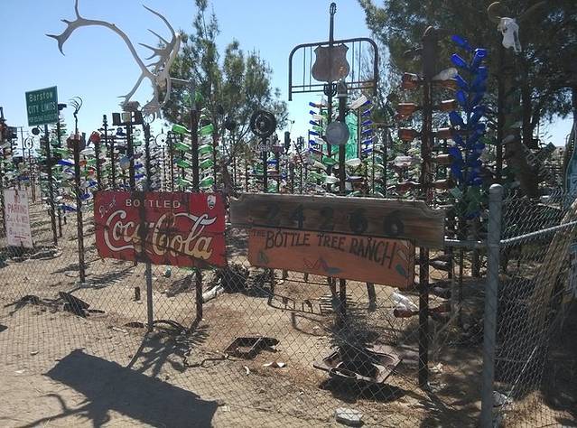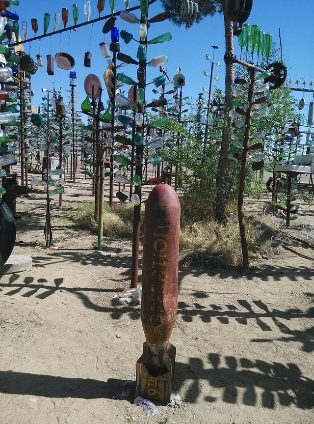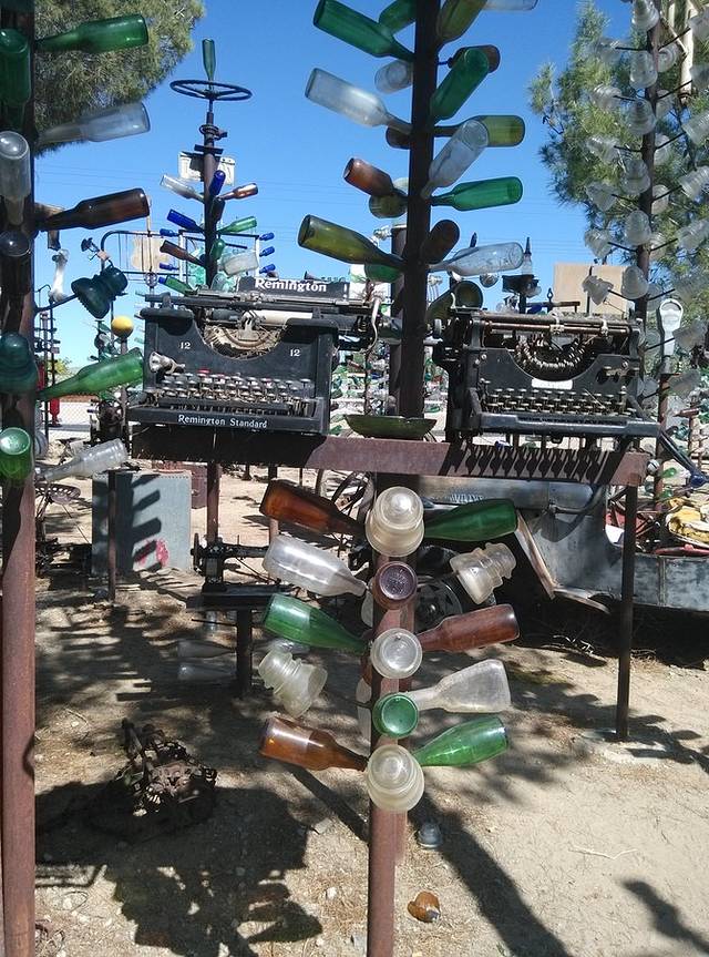 今天唯一要看的就是这个在海伦德尔的瓶子树农场。白胡子老头和他老婆住在这里,从他老爸开始攒瓶子,老头接着攒,2000年的时候,他花了一个星期建了200多棵铁竿子树,把一万多个瓶子挂起来了。老头到处收东西,满院子破烂,老外的爱好真是不可理解!不为生意,就是喜欢!昨天荒原上的hackberry店也是这样,不过好歹人家还卖货,这老头就是自己玩。