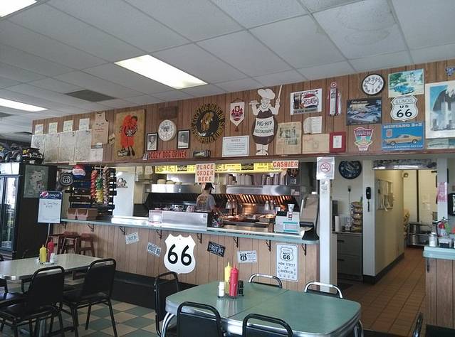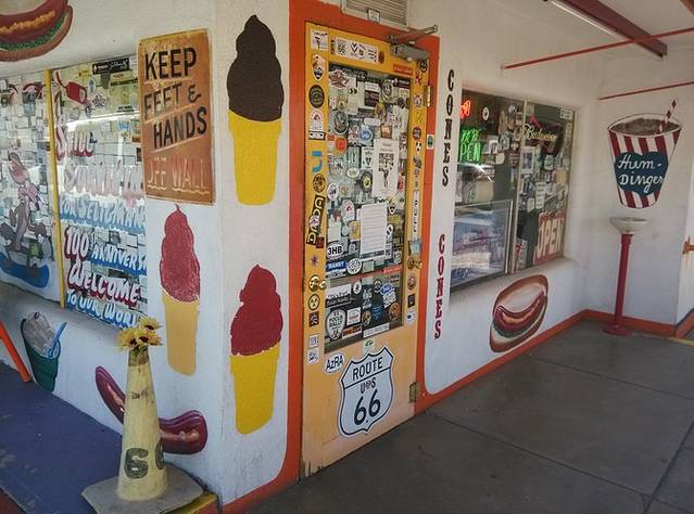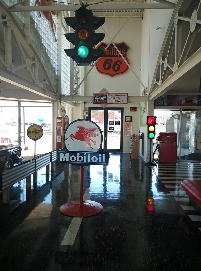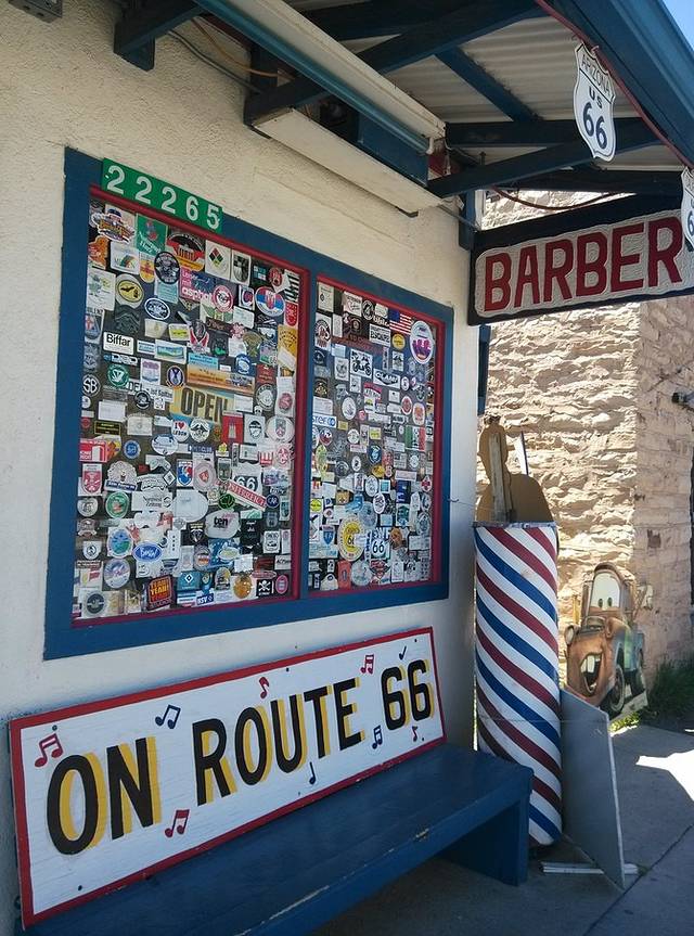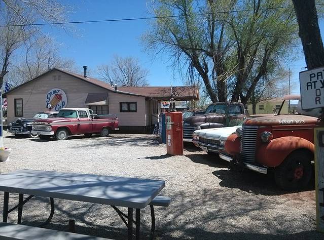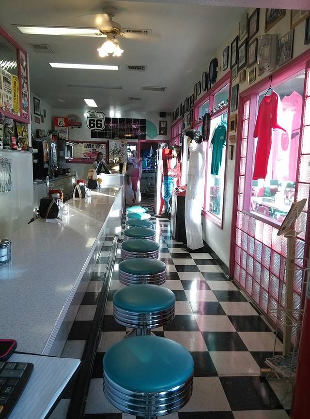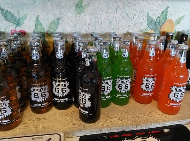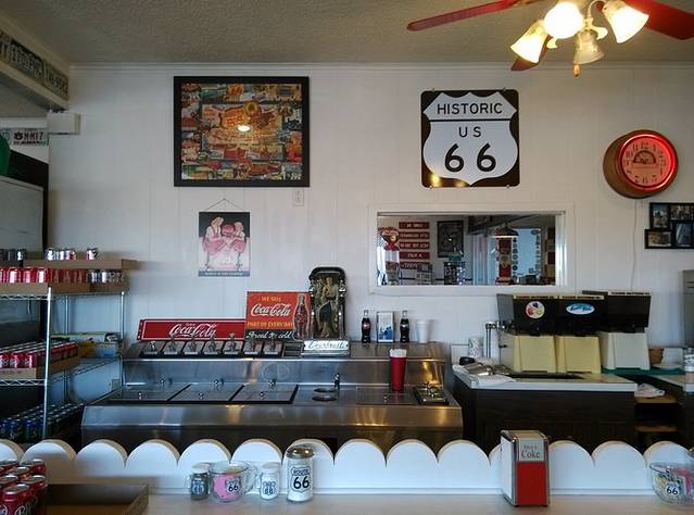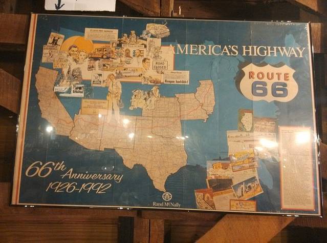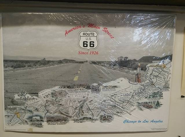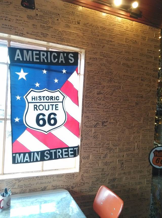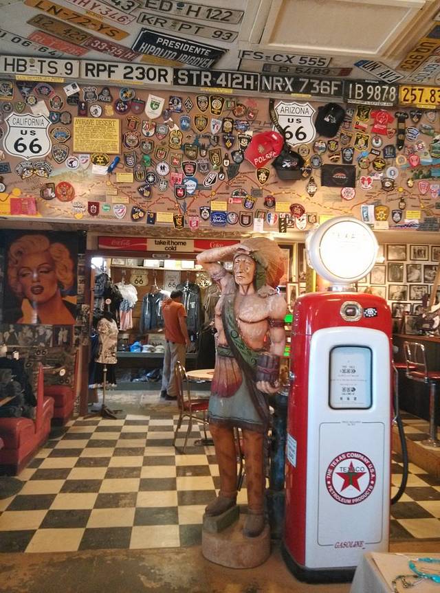 第三站Doc's Soda Fountain和Drug Store Museum,两家在一个屋里。墙上挂着世界地图,走66的人会在自己的城市插个小图钉。北京这里有一个人插了,我在旁边也用力按上一个。买杯招牌苏打水,味道很不错。昨天德怀特加油站关门没法按图钉,在这里补上。正如和前面旧物店老太太聊天,我说昨天我错过了很多东西没看到,老人家说,你也许错过了一些东西,但是后面你可能会发现更有趣的。确实是啊,昨天各种关门趴窗户,今天走这条路比走55更好玩。而且天气爆好,得有20多度,和昨天差两个季节。