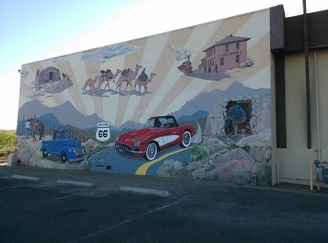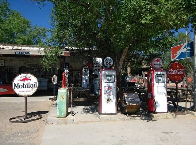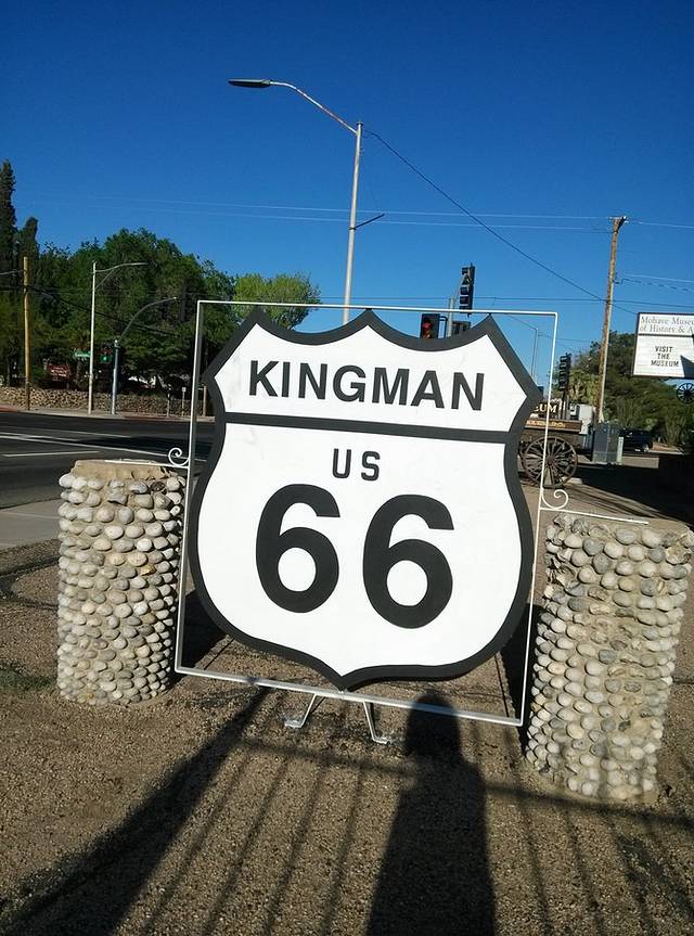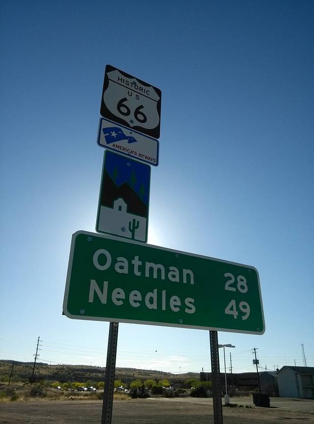威廉姆斯-金曼,途径赛利格曼,从赛利格曼到金曼没有走40号高速,而是向北转入至今保存最完整的一段66号公路,全长140公里。路过一个叫情人的地名。上午逛威廉姆斯,中午11点才出发,下午4点到达,行程131英里(209.6公里),很轻松,是66号公路元素爆炸的一天。