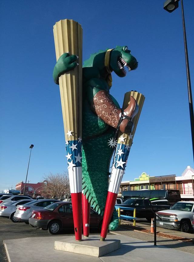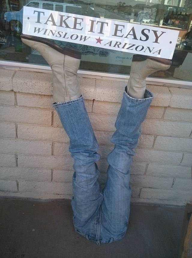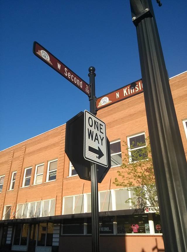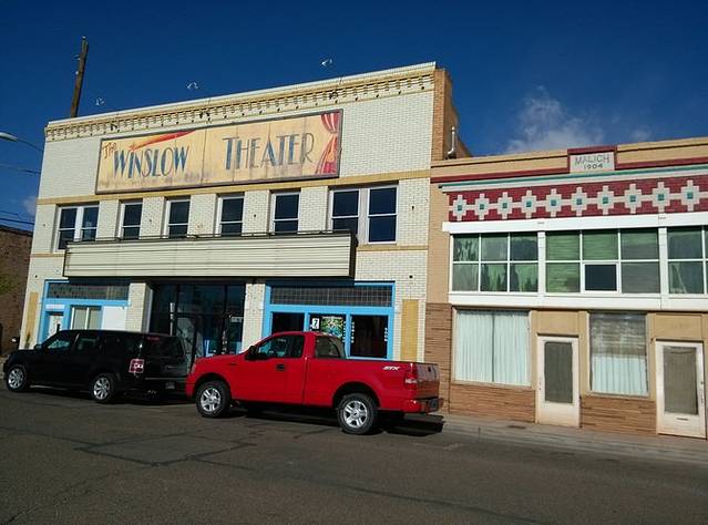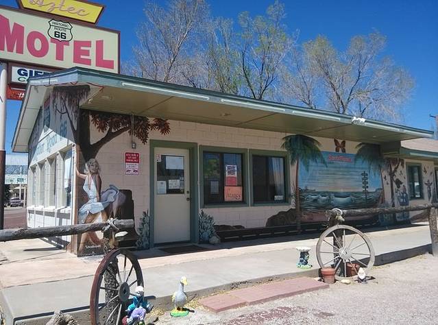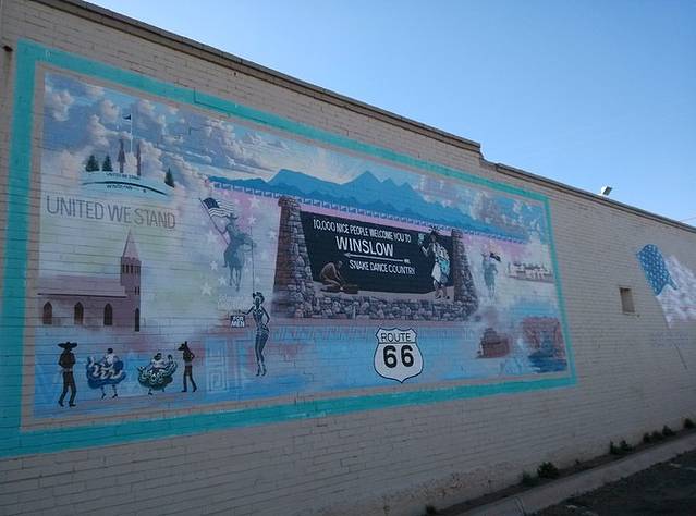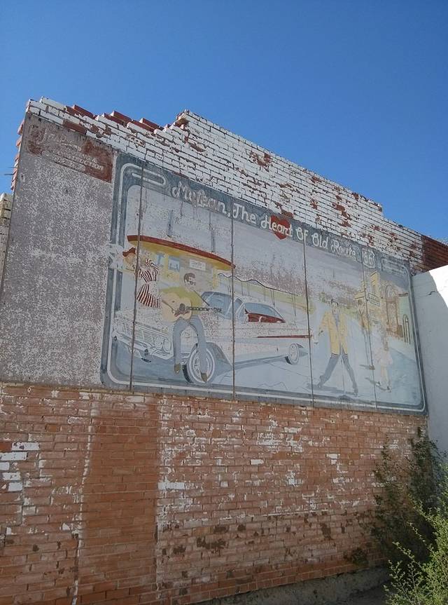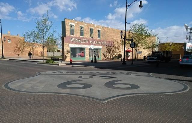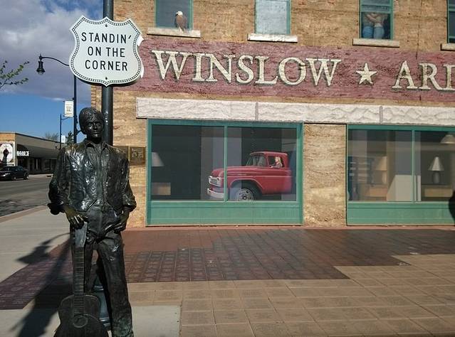 位于金斯利街(Kinsley)和第二街(2nd)的十字路口,地上画着最大的66标志,一帮人正在制作电视节目。夕阳西沉,建筑挡住了光亮,更增添了老气息。1972年,老鹰乐队把温斯洛写进歌曲《take it easy》,让这个小镇恢复了生机。