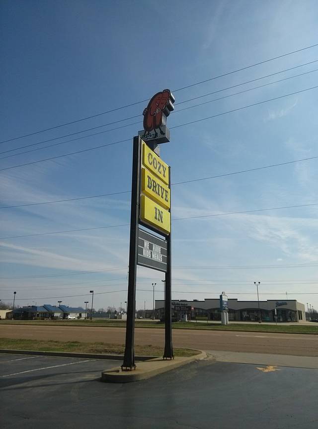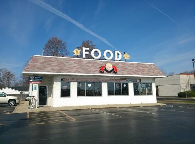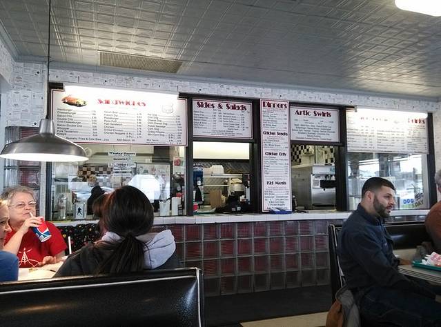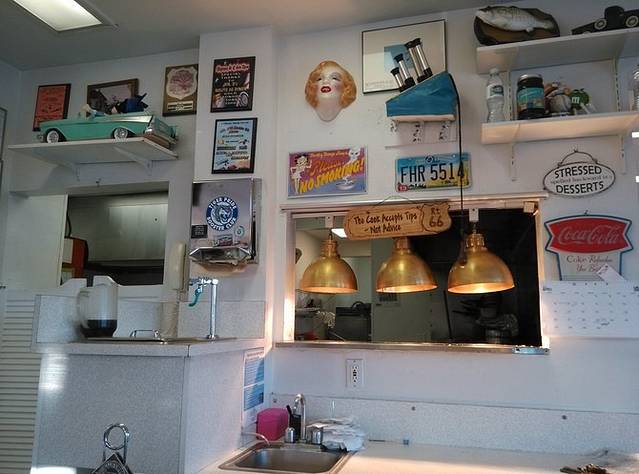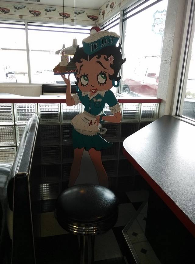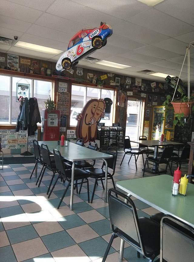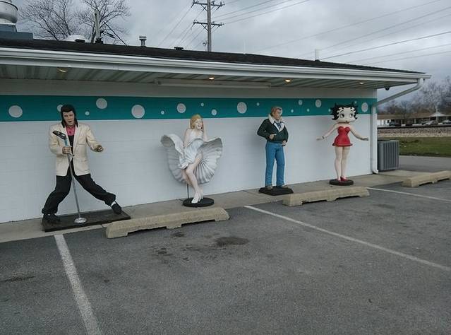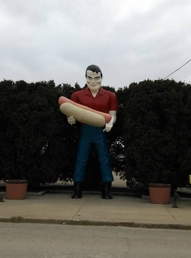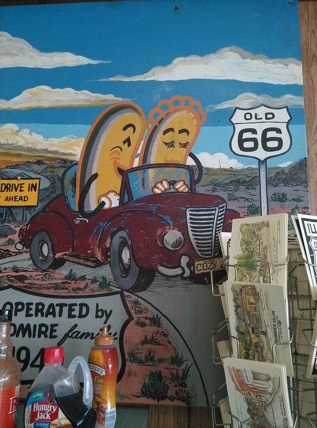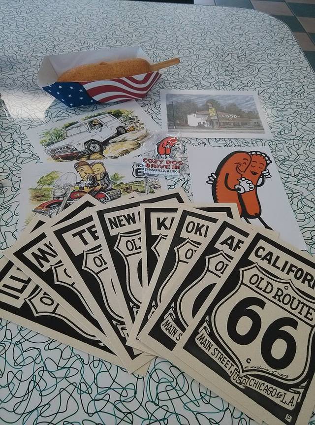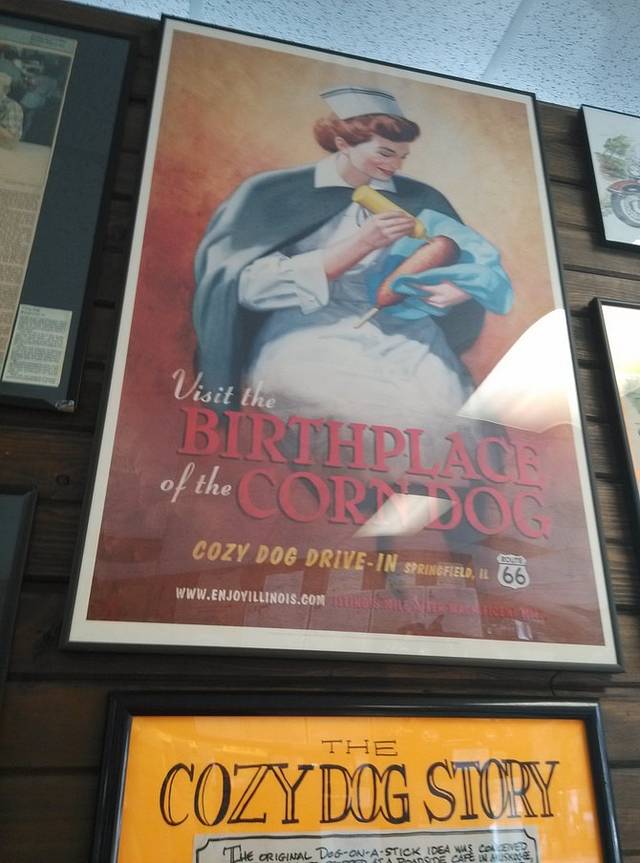 早晨出来第一站是cozy dog汽车餐厅,据说是鲍勃父母当年创建,玉米热狗是他和父亲发明的。餐厅的招牌是两个相拥在一起的热狗,非常可爱!