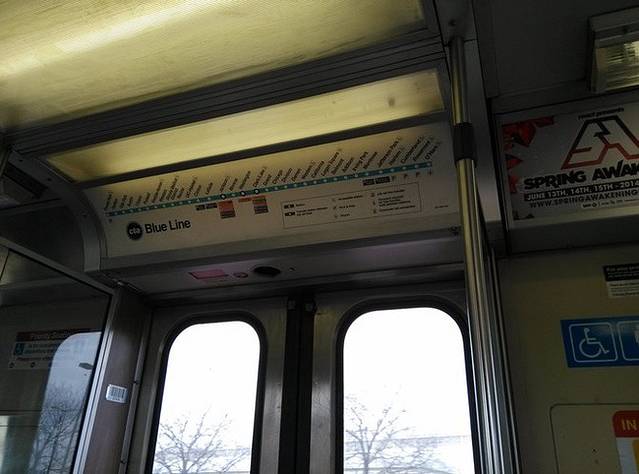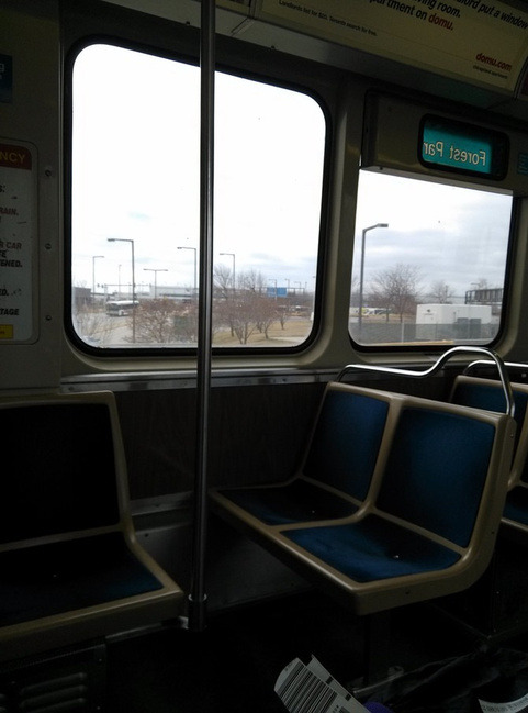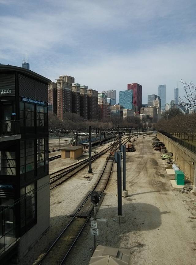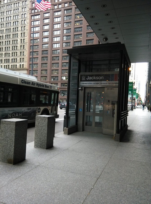 从达拉斯到芝加哥两个多小时,奥黑尔机场好大。跟着指示牌取行李出门,5刀乘坐蓝线地铁到市区。上车拿出手机里保存的酒店地址问路,乘车人指明车站,然后说你去哪里写纸条上,别拿手机给人家看以防被人抢走,真是好心人啊!车上老太太说,你个子那么小,这个箱子对你来说太大啦!