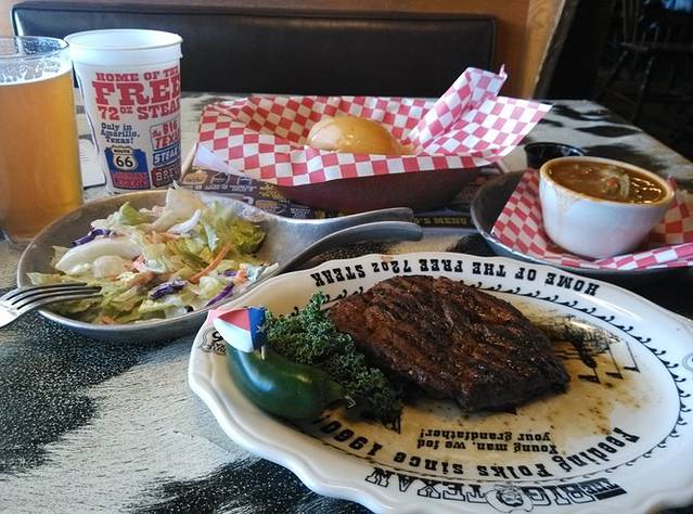 5点前赶到大牛排馆,以为能看到挑战72盎司牛排的场面,结果没有,挑战台上空空如也。店铺西部风格,服务员牛仔装扮,食客很多,没有小店的亲切感。点了最小份的牛排,怕生要了全熟觉得是个错误,味道不错但没了肉汁的鲜美。旁边就是大牛排开的旅馆,来杯啤酒,吃完直接入住。今天奢侈了,牛排晚餐27块,旅馆80。挣人民币花美金,伤啊!