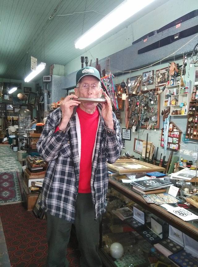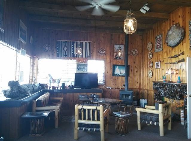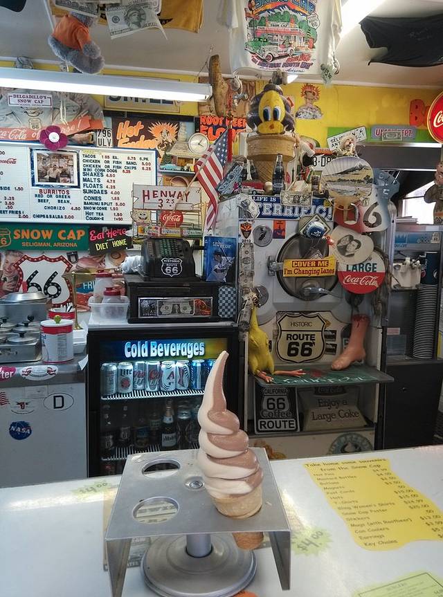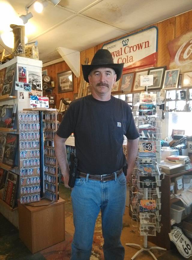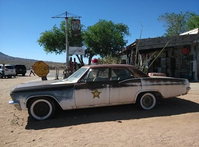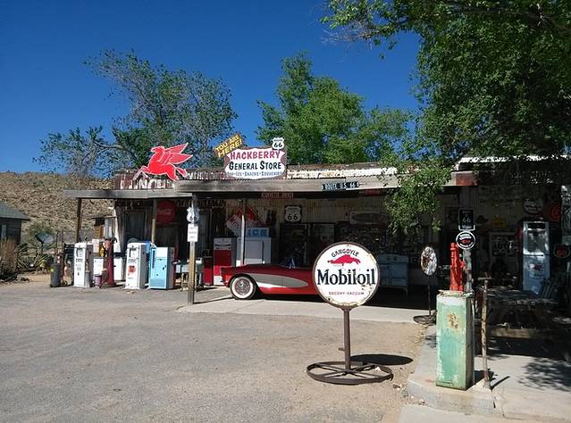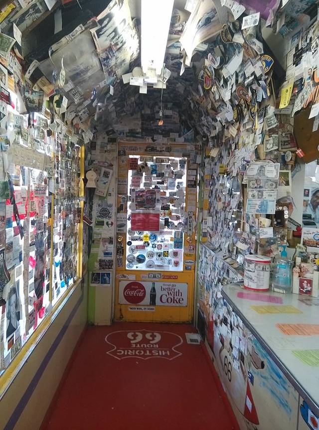 从赛利格曼到金曼,是66号公路保存最完整的一段,140公里。有些山路转弯,小case,车很少很少,非常好跑,经常保持在一百一二的超速状态。大概离金曼还有44公里的地方,荒郊野地突然出现这么一家店,名字叫hackberry。我一下就开过去了,一晃看到很多车停在那里,果断调头回来,事实证明回来的很正确!这家经常出现在66号公路的明信片里。依旧各种老物件,店主是个挎枪卖货的男人,很西部的感觉。我问他枪是真的吗?(问完觉得这个问题真够傻的)回答:是的。我又问你是警察,回答:曾经是。