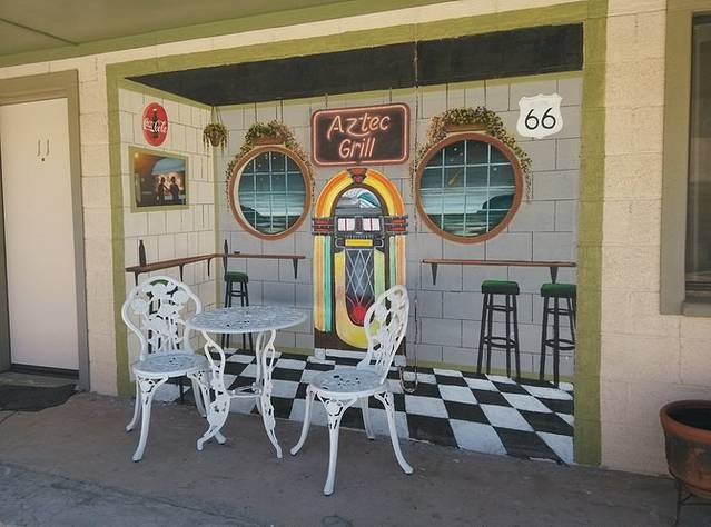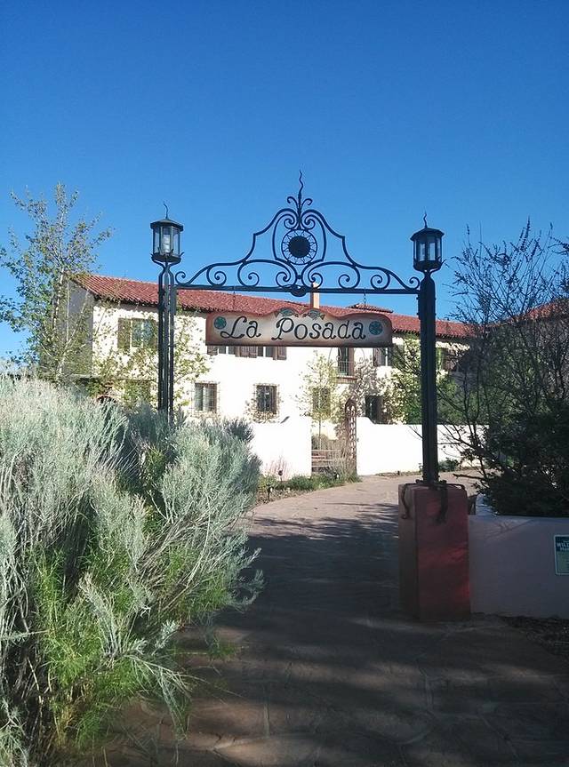 温斯洛。在莱巴嫩的时候,Munger Moss Motel的老人就让我到了温斯洛来住这家66经典的客栈酒店La Posada Hotel,始于1930年的老店,说很美很美。直接进到大堂,还one person one room one night呢,一问价,好家伙加税160多美金,人家说正好有一个空房间,平时一般都得提前预订,汗!我哪里住的起啊,只能say sorry,奔Motel 6了。酒店停车场停满了车,还有特意给特斯拉充电设的车位,能不贵嘛。