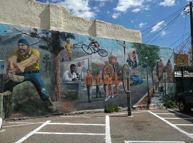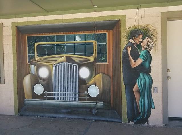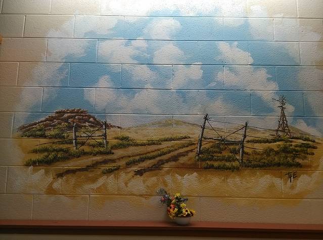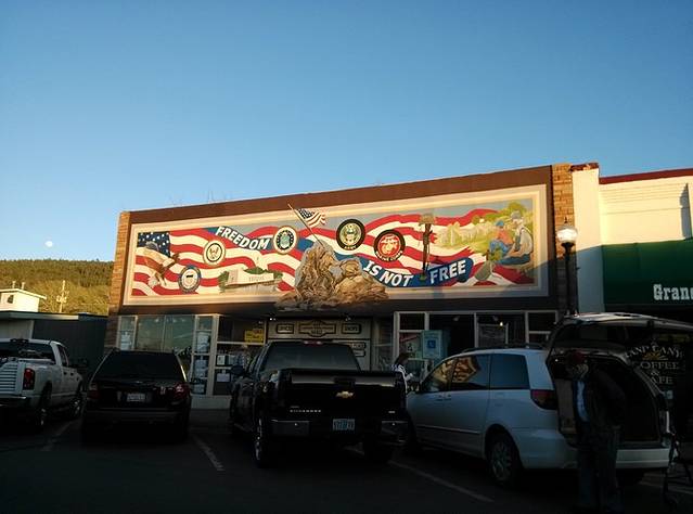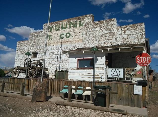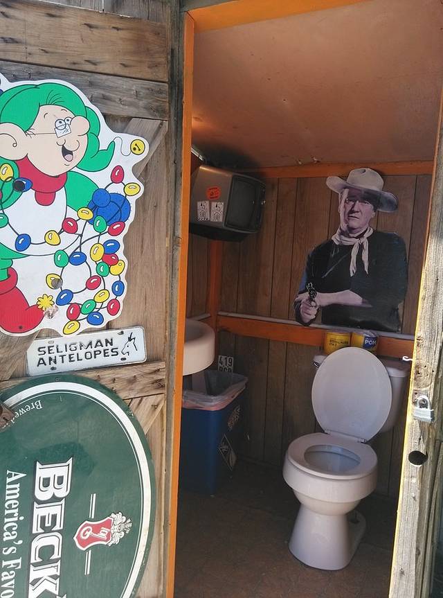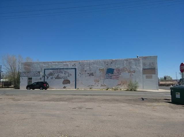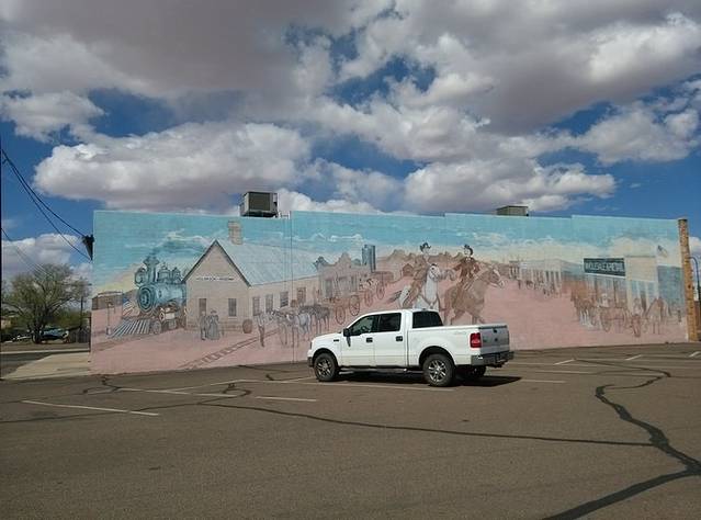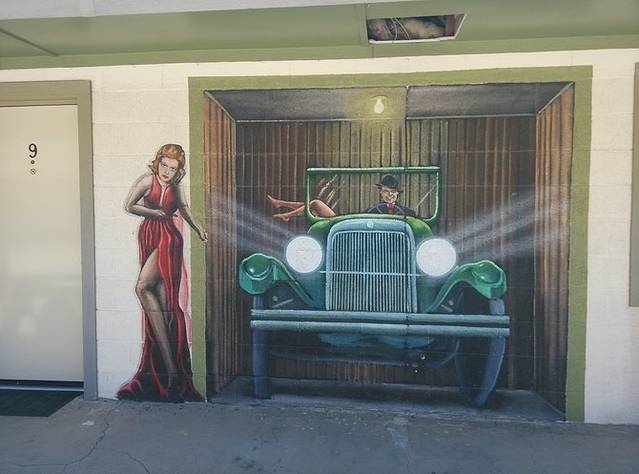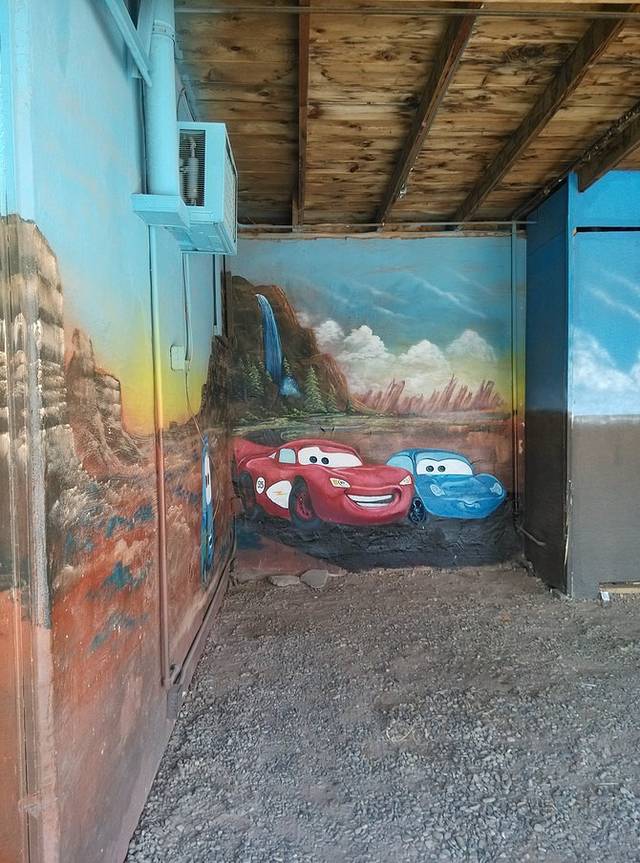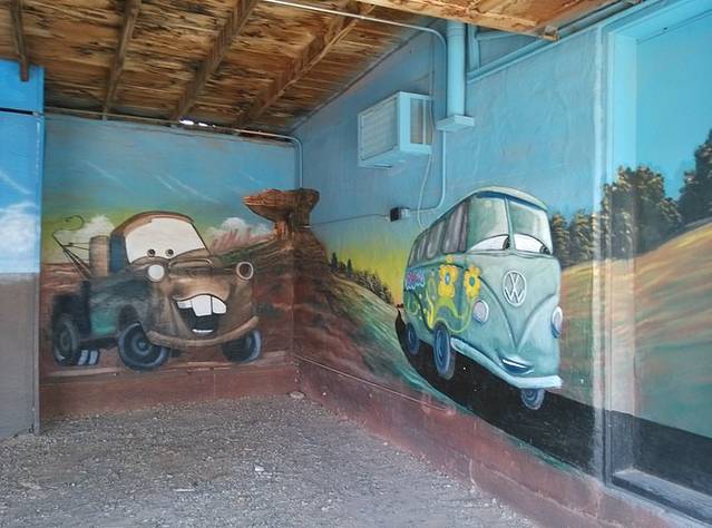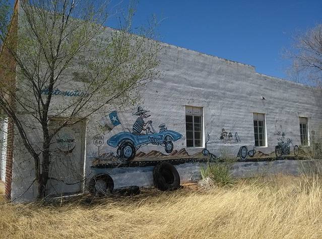 赛利格曼很小,就一条街,两边集中几家店铺,和威廉姆斯相比就是个小村。看到这家旅馆墙画挺好看,于是停车到房子后面的空地。小地方就是好,找个空场就能停车