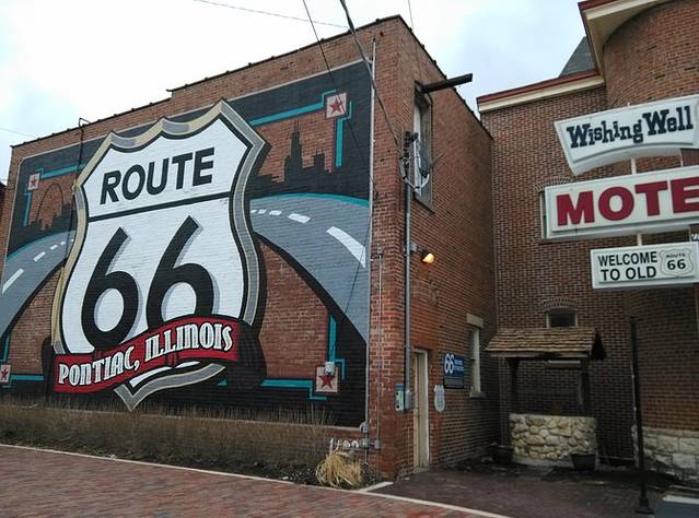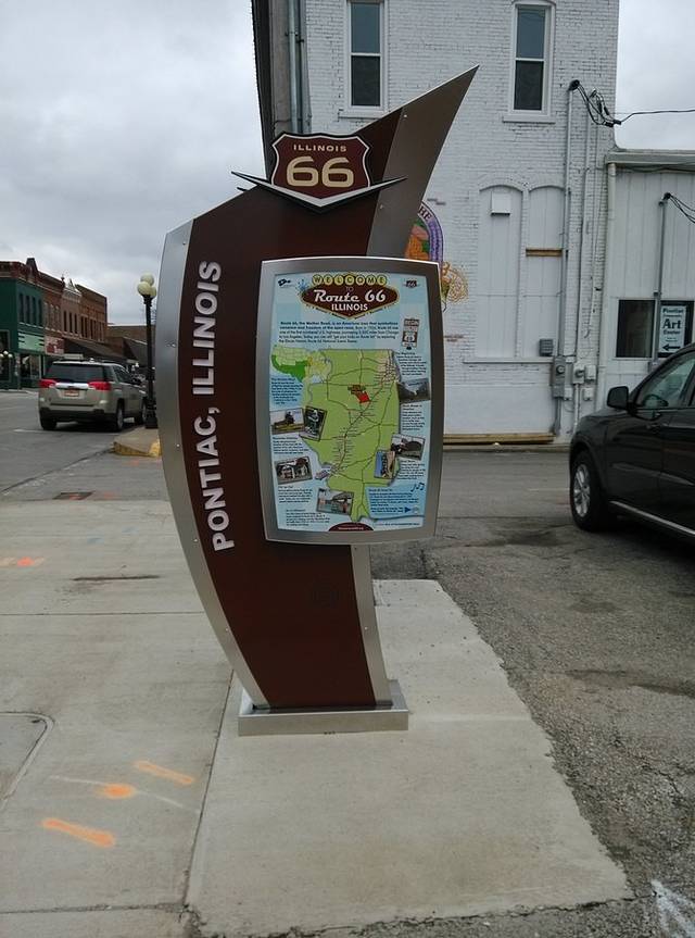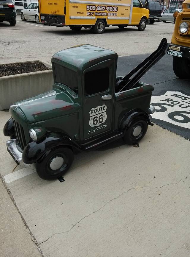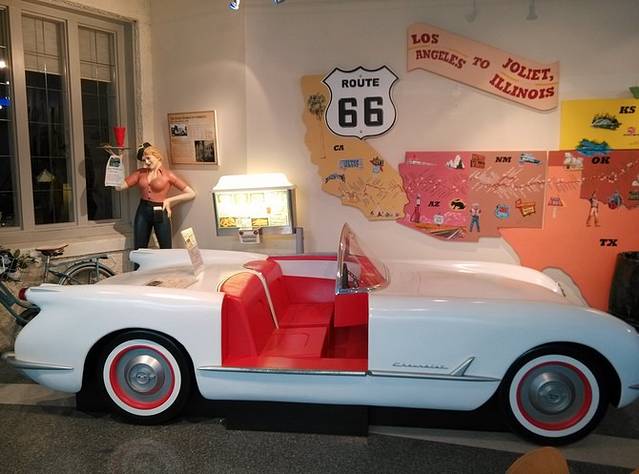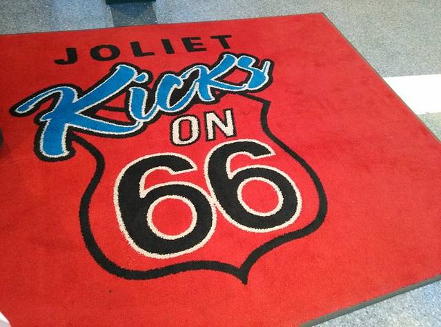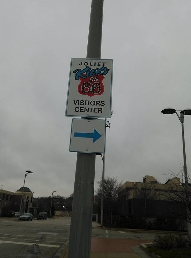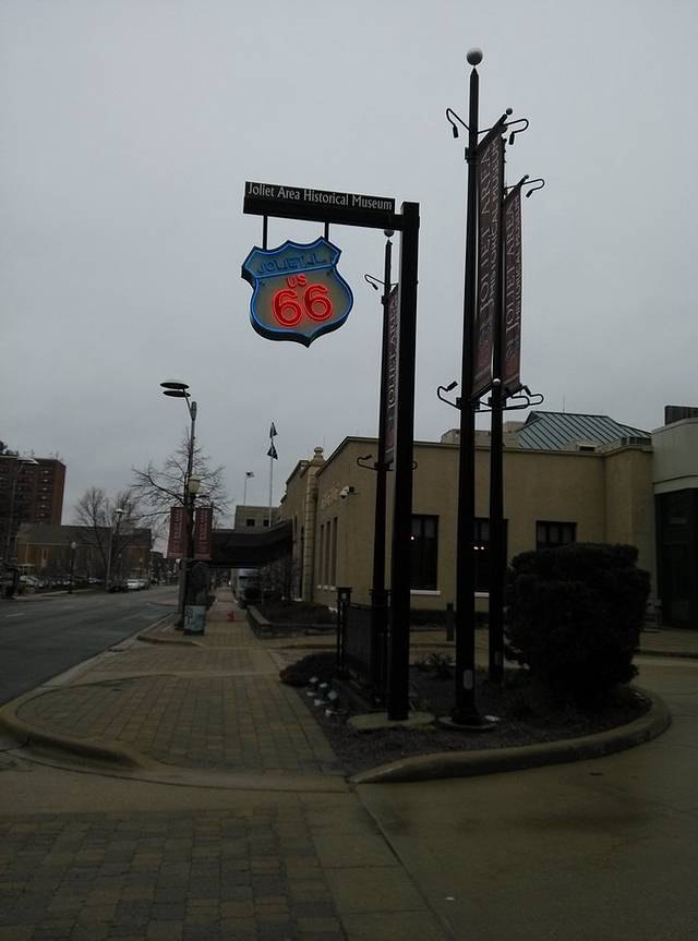 第一站,Joliet。小镇有几座跨河大铁桥,从一座桥上开过去的时候,远处的大铁桥正在开合,可惜开车没法拍照。不知道游客中心在哪里,只好找个商店前面的免费停车场把车停好,顺着路上的路标一边走一边打听。66号公路游客中心,工作人员是两个老太太,特别热心向每一个要走66的人介绍路线。其中一个老太太拿张复印的地图,给我画了其中一段路,说除了我别人不会介绍你走这条路,我年轻的时候自己走过,我都不知道去哪儿。我说我跟着GPS走,她说不要跟着GPS,我告诉你的这条路充满乐趣。明天的行程应该就是她说的那条路,与55号高速公路基本平行,我动心了。