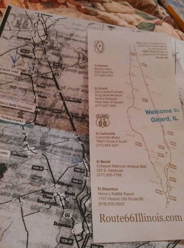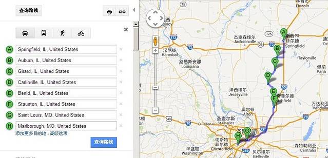 从Springfield出发,没有走55高速到圣路易斯,而是按照在Joliet游客中心老太太给我的地图走4号公路,途经Auburn-Girard-Carlinville-Benld-Staunton,再上55到圣路易斯。正如老太太说的,这条路可以找到很多有趣的东西,但走走停停更花时间。充满意外的一天。今天行程158英里(252.8公里),耗了一天,加上走冤枉路,比走55高速到圣路易斯多了将近50英里,但是看到有意思的东西却多了不少。