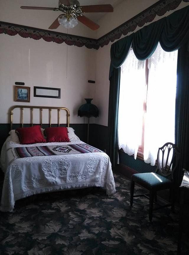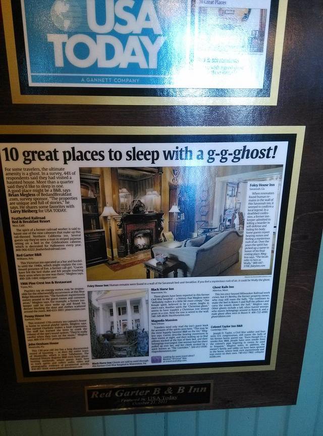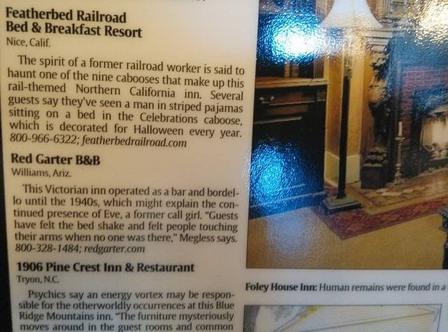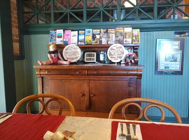 早晨下楼吃早餐,看到桌子对面墙上挂着一个镜框,走近一看,妈妈呀!这里是美国十大闹鬼的住宿地传说是一个叫Eva的应召女郎。有人说晚上会觉得有人摇床,还有人触摸手臂。我问店员是哪间屋子,说是1号房间。我TM昨天住的是2号,就在隔壁!店员说你很幸运哦昨天上楼,没人的房间都开着门,我还跑到1号房间拍了张照片!早餐看到两个男的离店,又看到一对夫妻吃饭,幸亏昨晚不是我一人住这楼里,朋友在微信里开玩笑说你是女的没事。这个店的logo就是Eva。