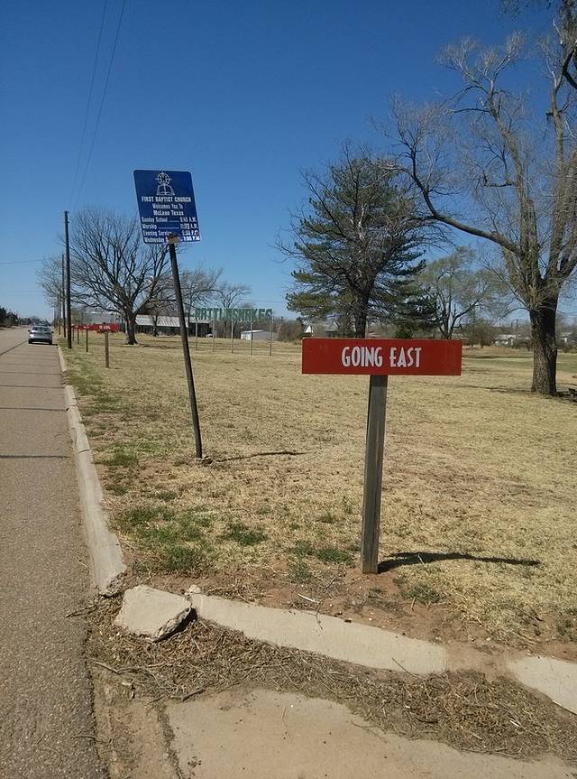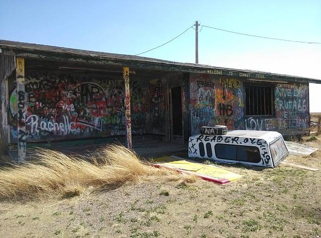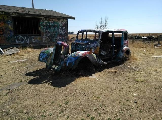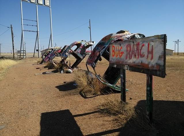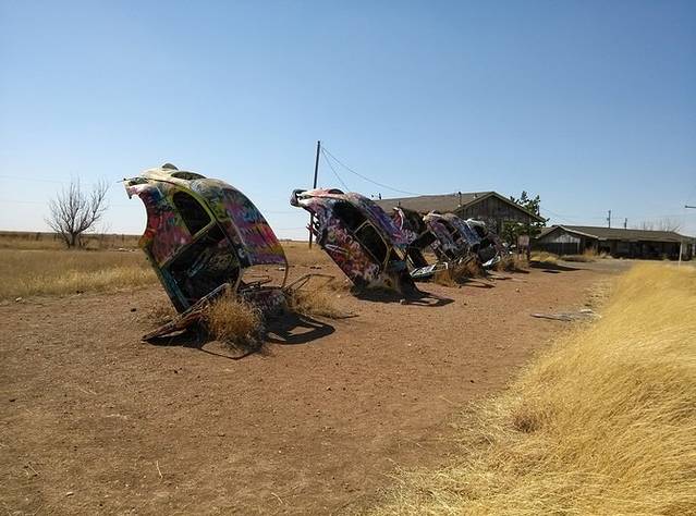 Groom倾斜的水塔。高速边鬼城Conway镇入口废弃的房子和车,满是涂鸦。一排甲壳虫,模仿凯迪拉克农场,风吹过车门或者房门嘎嘎做响。虽在烈日下也觉得后背发凉,没敢进小镇,直奔Amarillo大牛排餐馆。