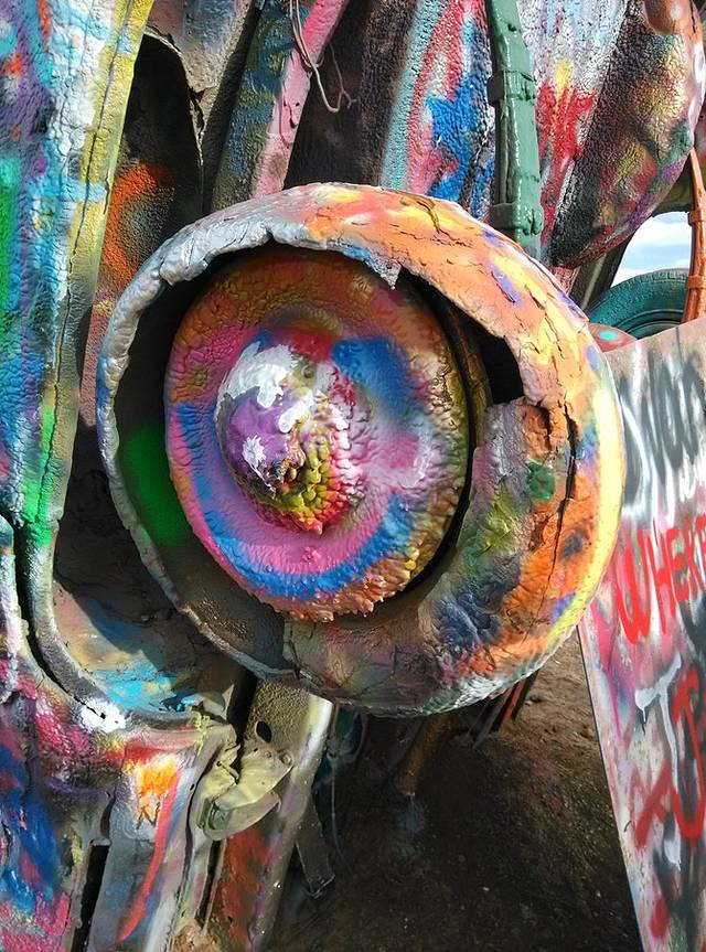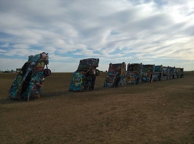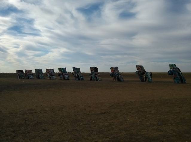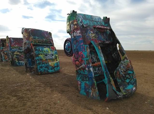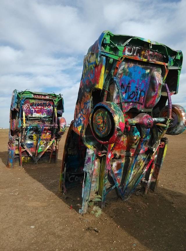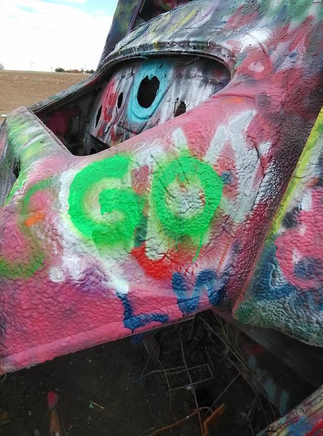 出大牛排西行20多公里,就是有名的卡迪拉克农场,10辆卡迪拉克斜插进大地,随便涂鸦。捡了地上剩的喷罐,写了大大的GO!