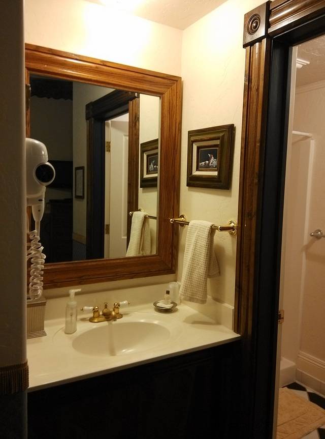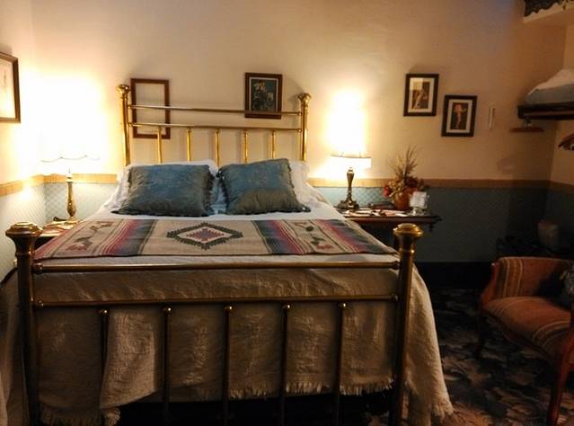 女店员很能聊,一点一点介绍情况,怎么吃早餐怎么用钥匙,走哪个门怎么注意安全,这种私家旅馆不是酒店,所以要听明白。因为一楼大厅是蛋糕房加礼品店,晚上会关门,住店客人要从大门边的侧门进出。 我问这个楼是不是老房子,女店员说差不多有120年了。沿着狭窄陡峭的楼梯上二楼,总觉得有点诡异气氛,房间布置老派精致又暧昧,床高的快到我腰了,上床靠爬,下床靠蹦。所有用品都很讲究品质,有点小奢靡的味道。早晨还在汽车旅馆,晚上就换了口味,长途旅行总得有时候奢侈奢侈,犒劳犒劳自己。楼上就几个房间,我来的时候都空着,这大晚上我一人住这老房子里还真有点怕。女店员说有两个房间预订的人还没来。