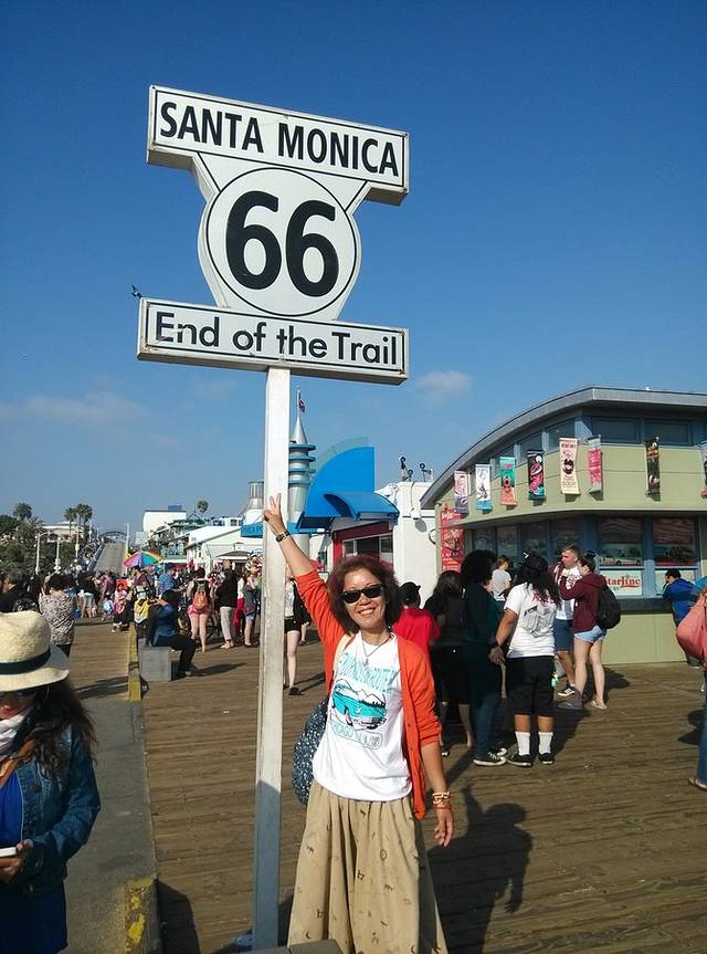 随着越来越近,我的心开始砰砰直跳,就象经过千山万水要见到自己的爱人一般激动不已。桥的前半段可以走车,行人步道很窄。游人如织,脚步缓缓。我夹在行人中,恨不得马上奔到终点,可是只能跟着前面的人往前慢慢挪。走过圣莫妮卡码头的桥,一路寻找66终点路牌,心情无法抑制的激动。当看到路牌的一瞬间,眼泪夺眶而出,整整13天啊,终于平安到达了!如果有同行的人,我相信此刻我们会拥抱会欢呼会雀跃会撒了欢的庆祝。可是,没有同行者,这里只有我一个人!我呆呆的站在人群中,站在终点牌下,眼泪止不住的流啊流。。。很多游客在和路牌合影,对于他们来说只是个景点而已,对于我来说却是个难忘的旅程。