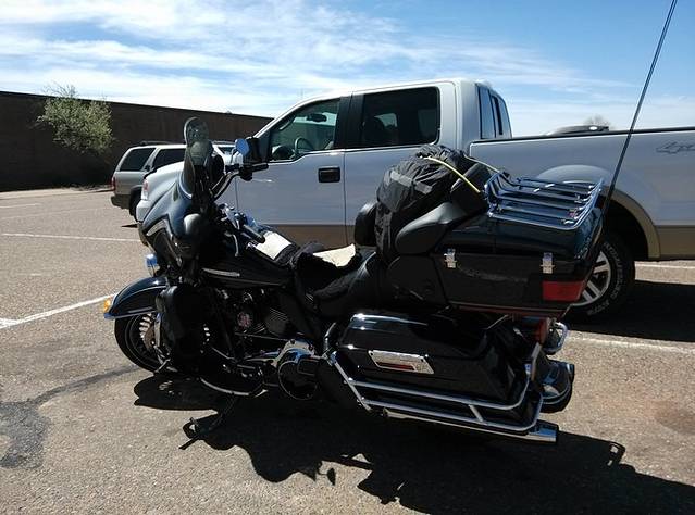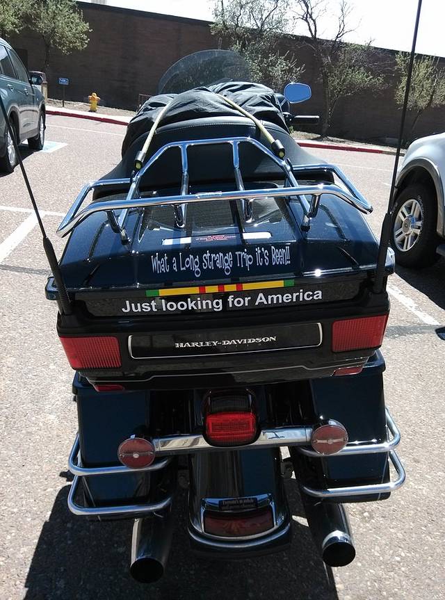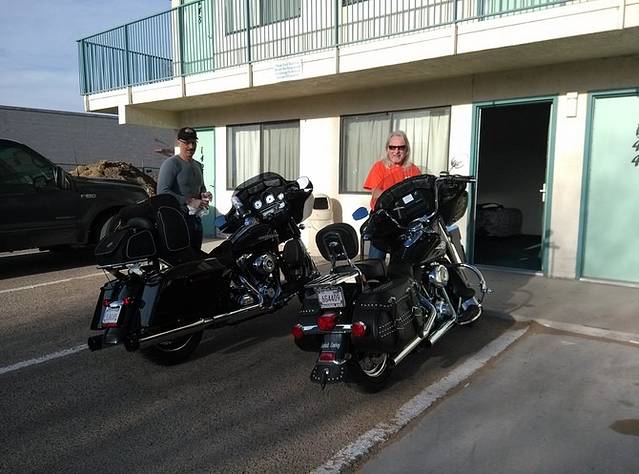 老天保佑啊,GPS恢复工作了,估计昨天是晒着了,真是吓死人! 一早出门,汽车旅馆停着各式旅行者的车,碰上俩哈雷骑士。
