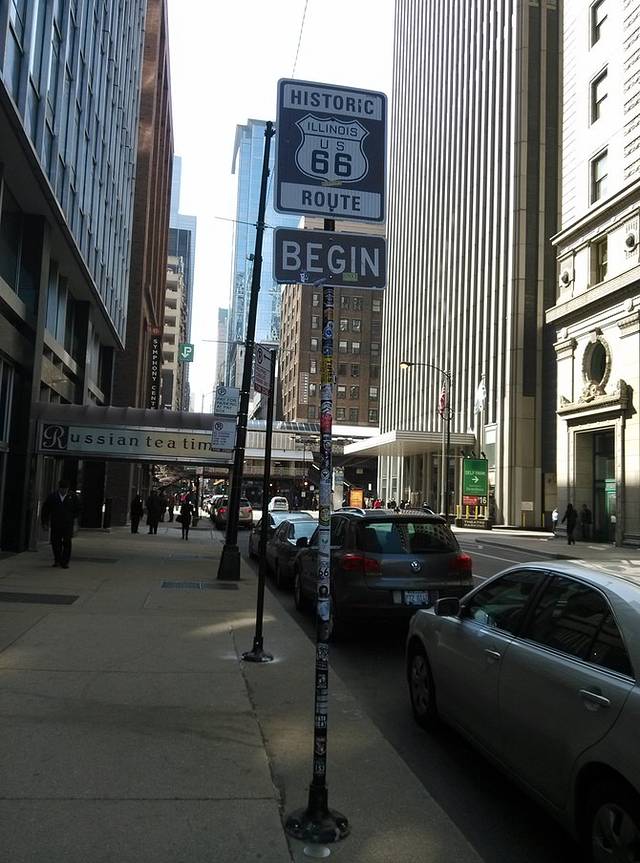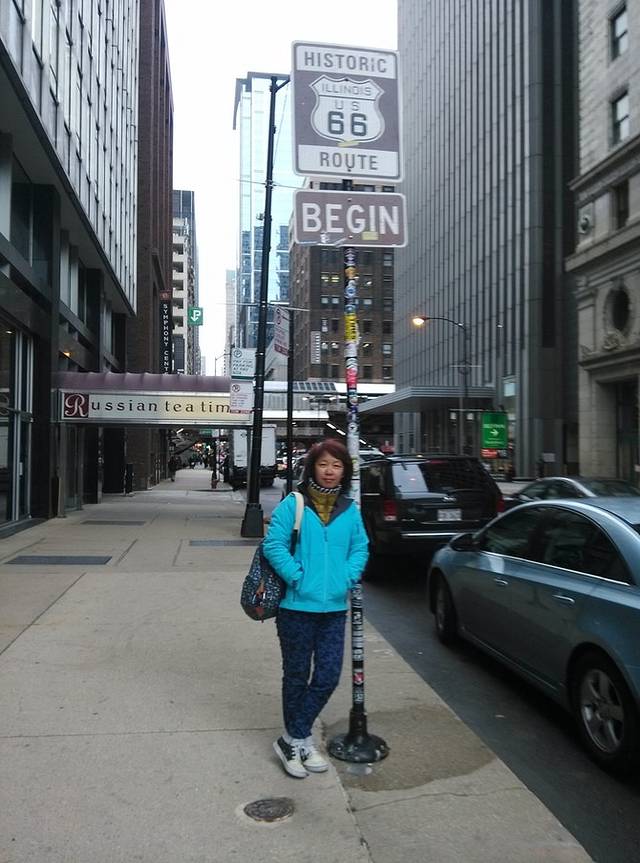 我奔芝加哥来最最重要的目的,没有之一,就是66号公路起点!!!一个小小的不起眼的牌子,立在美术馆对面的亚当斯街口,无数路人从它身边经过没有任何感觉。但是对于要走66的人来说,这是一个仪式,来这里就意味着出发,向着心中的梦想出发。