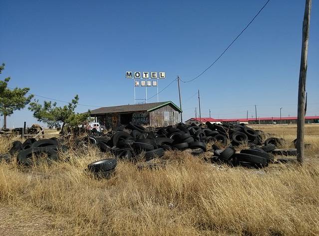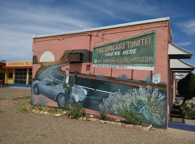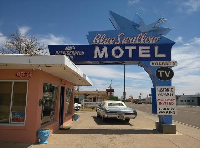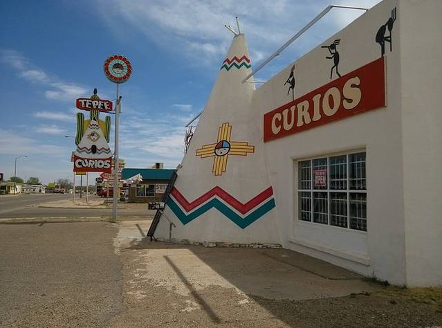 午到达Tucumcari,酷热!这里是电影《黄昏双镖客》的拍摄地。这时候如果出来两个牛仔互相拔枪对射,简直太应景了。始于1944年的Teepee是纪念品店,印第安帐篷风格。又一个经典旅馆蓝燕,车库里都是墙画。可惜,今夜,不能在土坎姆凯瑞!旅馆斜对面有家中餐馆,菜品少不好吃,老板娘广州的,拉着我跟我一通海聊,还劝我不要走小路去圣达菲,不是我果断上车,不定聊多久呢。天气太热,吃饭时忘记把GPS取下来,上车的时候发现已经晒的掉下来了,巨烫手!