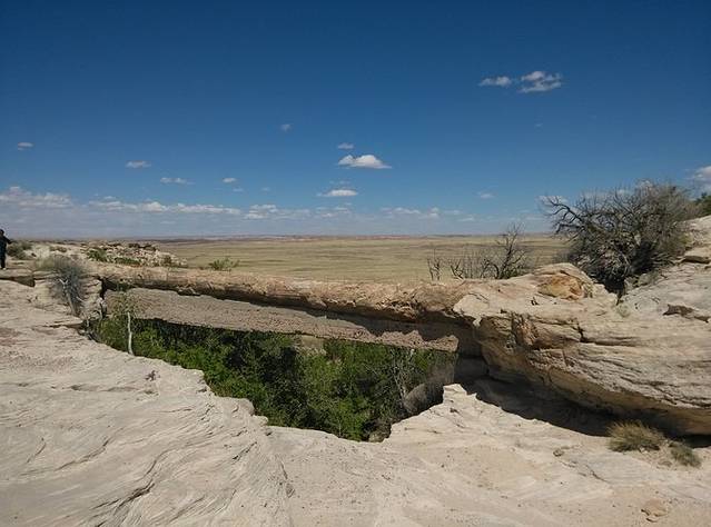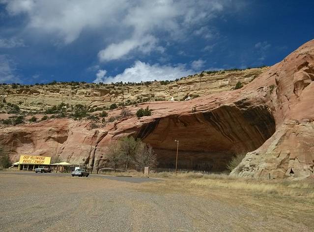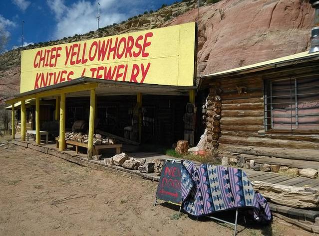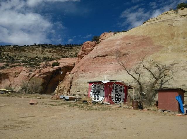 断崖下的黄马酋长交易站,早已物是人非关闭了。新墨西哥州和亚利桑那州的分界线正好从交易站的屋内穿过。一个看似拾荒流浪的老人说可以带着我去周围参观,要付一点点费用。一个人还是谢绝了,继续前行。过州界,时钟往回拨一个小时。这种感觉真好,立刻时间富裕好多。