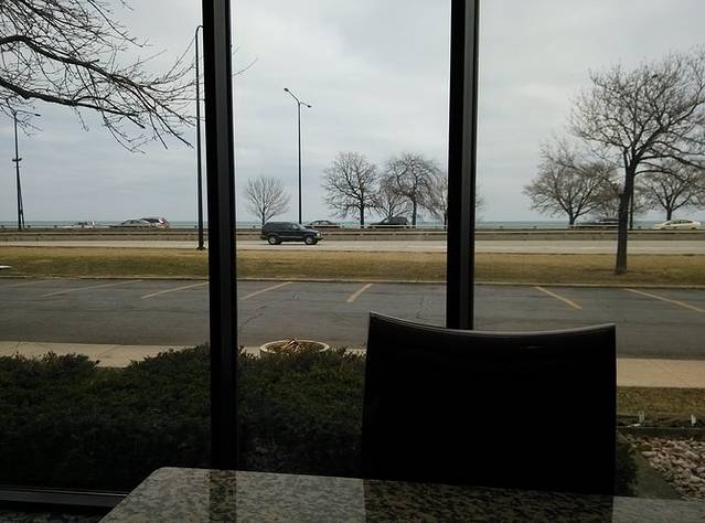 从餐厅可以看到密歇根湖,视野很开阔。风大寒冷,室外也就5,6度。