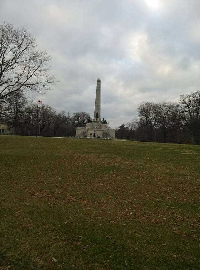 到达林肯墓已经是下午的6点左右,天阴阴的,冷风嗖嗖,这天气和墓园的气氛太搭了!快步上前拍几张照片,林肯铜像的鼻子被人摸的光光亮。墓园里没有人,远处看到全副武装的美国大兵在墓地里训练。