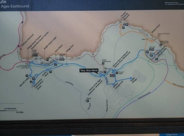 旗杆镇穿行,火车站游客中心向一个长的很像哈利·波特的工作人员咨询路线后未停留奔大峡谷,结果还是拐错路口没上180公路,走了40号高速。 大峡谷门票一车25美金,具体没看几天有效,门票贴玻璃上可以反复进出, 给地图还有中文简介,买票时要出示身份证或者护照。游人众多,游客中心停车场停车费劲,厕所是我在美国见到最脏的一个地方。公园内道路枝枝叉叉,进去直接犯蒙!找了另外一个停车场停好车,坐园区内穿梭游览车看了几个观景点,震撼没惊喜。厚衣服放车里了,太阳晒着风却挺冷,速速离开,不喜欢。来回往返接近180公里。 大峡谷南缘巴士图。分蓝线橙线和紫线,单向绕圈,以游客中心为换乘点,发车间隔很短,不像优山美地半个小时才一趟。可以在里面住宿,喜欢户外的人可以徒步骑行等。对我没啥吸引力。
