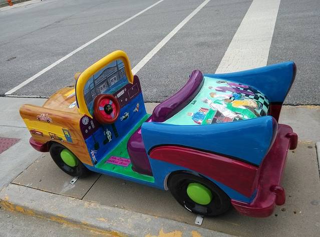 最搞笑好玩的就是这家,叫Snow Cap的小店。正好在我停车的马路对面,话说我停车经常停的很是地方。后面院子里停了好多老车,玻璃上都画了大眼睛,有趣。还有好多乱七八糟的东西,地上的两条大腿还真吓我一跳小店俩门,四个把手,写着拉的反而进不去,一般人都会上当哈哈大笑。进门小小走廊,铺天盖地都是各种名片纸条,糊的满满的。买个冰淇淋,要一半香草一半巧克力的,老板拿出半个蛋筒壳问是这样的吗?好有意思的小店!