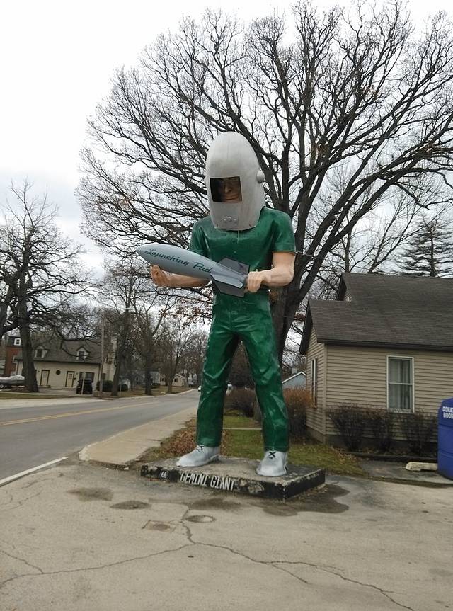 博物馆里很暖和,咬牙出门。离开Pontiac继续前行,依然有风很冷。到达小城Atlanta,把车停在班扬巨人对面路边。车边是66的博物馆,玻璃窗上OPEN的霓虹灯亮着,可门却紧锁。路上没有行人,到隔壁的咖啡馆打听,人家也不知道工作人员去了哪里。门外冷风中等了一会儿,见没人来只能作罢离开。