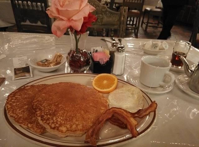早餐没吃,酒店餐厅点了份菜单上从1937年保留至今的套餐,松饼很松软,叉子插一块就碎渣,培根也是酥的,真想拿手抓着吃。酒店大堂摆个紫水晶洞,表的刻度是绿松石,椅子牛XX。