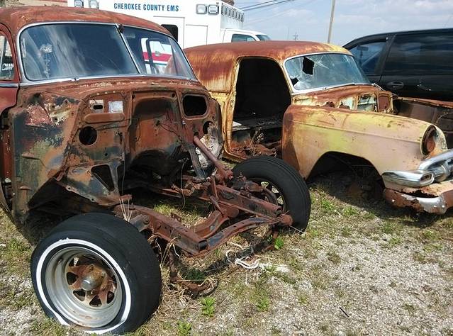 沿街店铺门前屋后到处是老车。像不像水箱温泉镇?