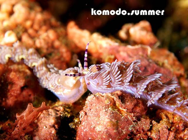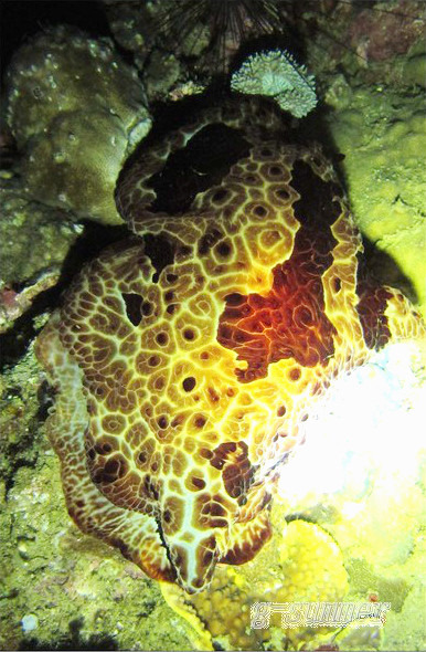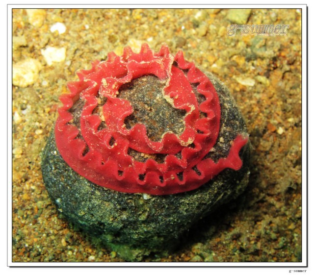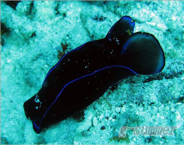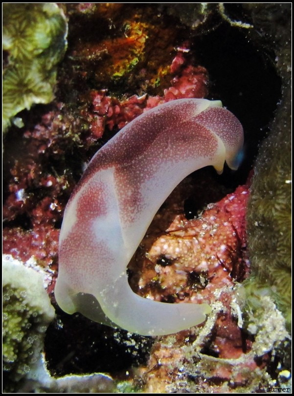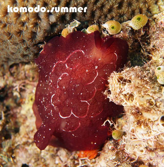 说明: 照片上的这一只没有那么大,也就10厘米左右,不过的确在一次夜潜看到两只大的,就有30厘米左右,只可惜追光的小虫子太多,照片全是模糊的。这种海兔呈酒红色,肉肉的感觉,像个厚厚的肉垫子,但却有一对小小小小的耳朵,这也太不协调了吧,我看到的这种背上有白色细花纹,还有背上没有花纹,统统红色的。