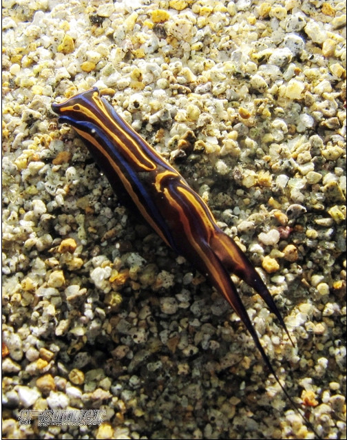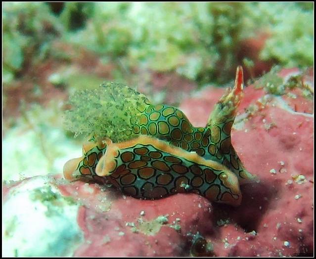 说明: 非常小的海兔,拍照的时候基本看不出花纹,等回来一放大照片,哇!真是漂亮呀,满身都贴了黄瓜片,还挺注意美容的。这是我非常喜欢的一种。
