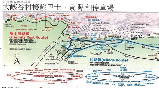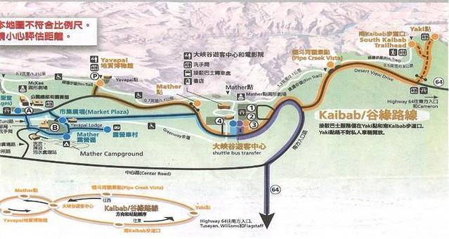 南缘进入后,从“游客中心”可以搭乘园内shuttle bus去往各处。这个bus分为黄色(去西边,自驾车也可以走),蓝色线(去东边,自驾车也可以前往),红色线(不允许自驾进入)。我们把车停在入口之后的“游客中心”的,全部乘坐shuttle bus,因为园内不熟悉路,而且停车的话觉得也不是很方便。大峡谷西缘是不属于大峡谷国家公园的,有个skywalk在那边。