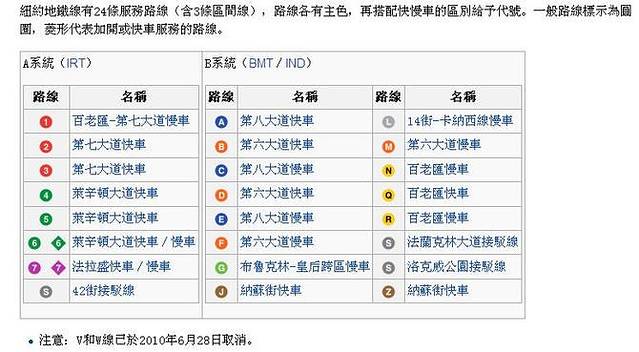 纽约的地铁分 1, 2, 3, 4, 5, 6, 7, 9, A, B,C, D, E, F, G, J, L, M, N, Q, R, S, V, W, Z 等线,还有快车〈Express〉及慢车〈Local〉之分,其差别在于快车只停靠大站,慢车则每站皆停。简单说来,纽约地铁简化及分成三大系统: 1. IRT (Interborough Rapid Transit) 2. IND(INDependent Subway) 3. BMT (Brooklyn Manhattan Transit) IRT 线由于规格上和IND 以及 BMT 不同 (IRT 所容纳的车厢比较小),所以无法与 IND 或 BMT 相连,而事实上IND 与 BMT 早已相通,因此在路线上 IRT 是以数字表示,IND 与 BMT 系统则是以英文大写字母来表示。
