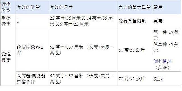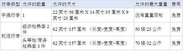 每位持头等舱或商务舱机票的乘客可以免费携带三件托运行李和一件手提行李,每位持经济舱机票的乘客可以免费携带两件托运行李和一件手提行李。行李的尺寸限制以行李箱的外部尺寸计算。