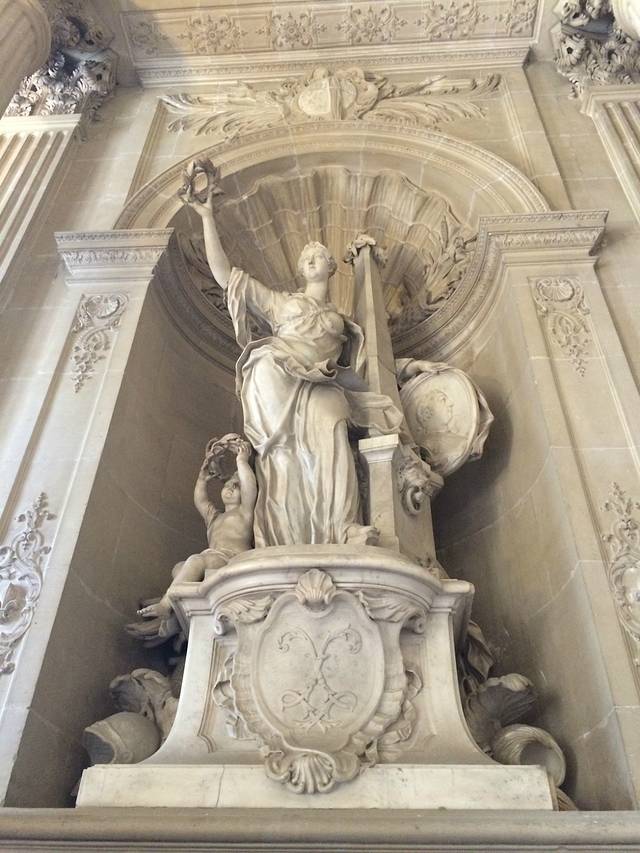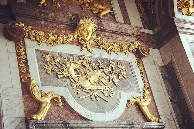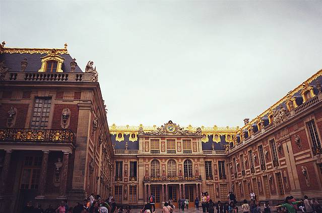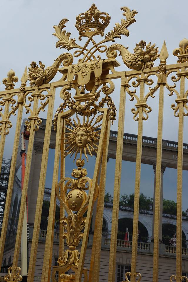 穿过放有路易十四骑马雕像的广场,就看到凡尔赛宫金灿灿的大门,大门上有太阳神的图案,被阳光一照,令人眼花。